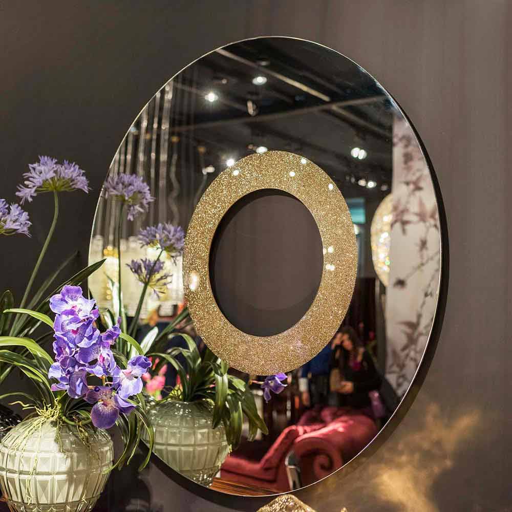 Runder Spiegel Aris in modernem Design, hergestellt in Italien, Glitzer und Glas. Wandspiegel, modernes Design. Aris wurde vom Designer Giorgio Ragazzini entworfen und ließ sich von den Planeten des Sonnensystems inspirieren. 100 % Hergestellt in Italien.