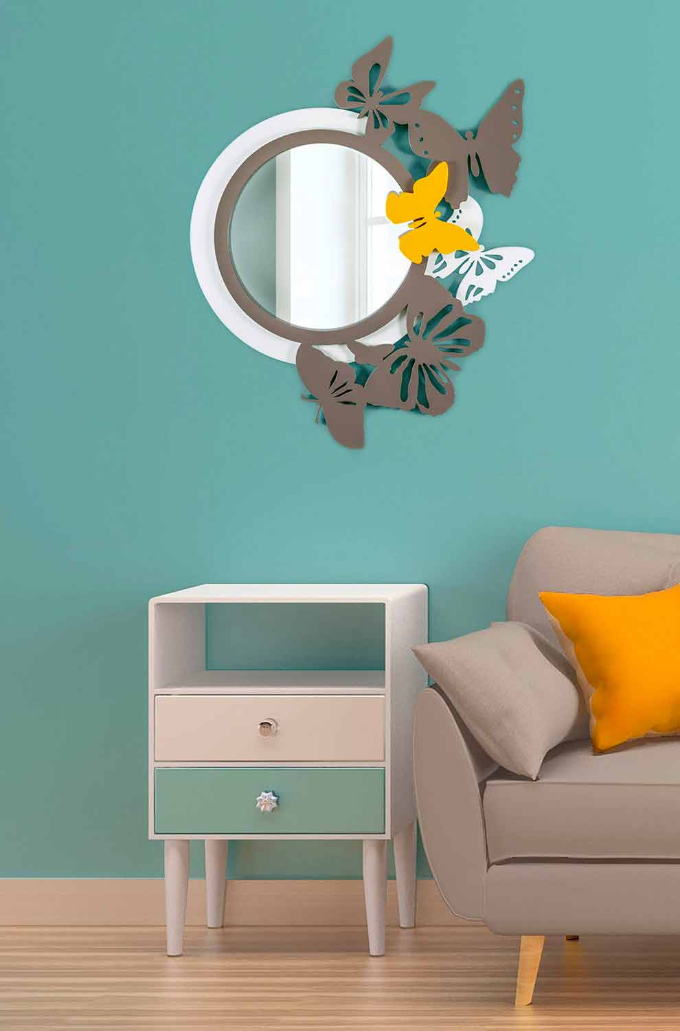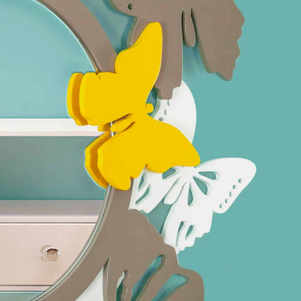 Moderner und runder Wandspiegel aus farbigem Holz mit dekorativen Schmetterlingen, hergestellt in Italien.