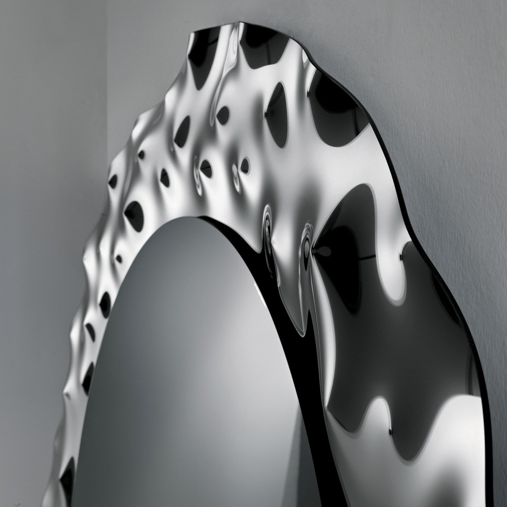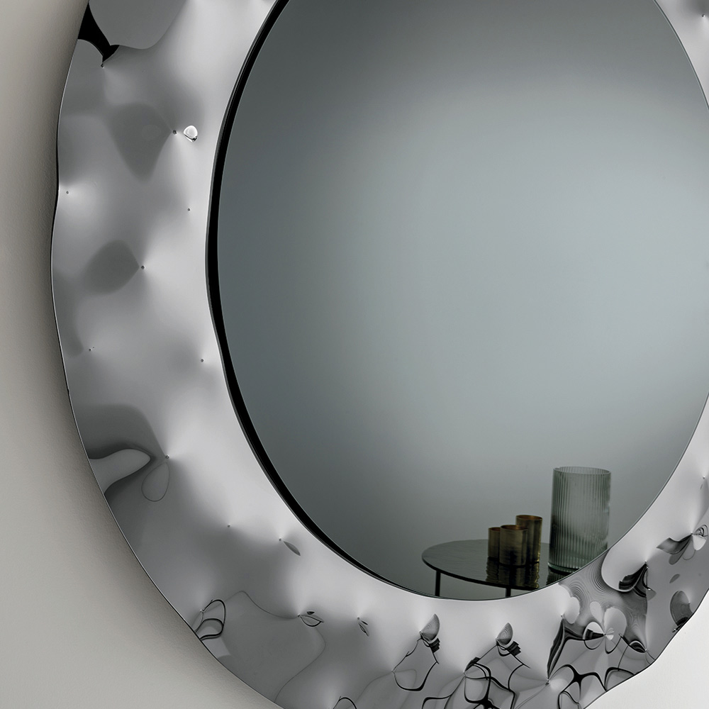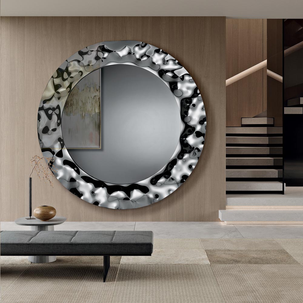 Die reflektierende Oberfläche wird von einem Ton-in-Ton geschwungenen Glasrahmen eingefasst, der sich entlang der Spiegelkante erstreckt und ein elegantes Spiel von Licht und Textur erzeugt. Die einzigartige Glasoberfläche verleiht der Komposition Tiefe und Dynamik und unterstreicht den modernen Charakter des Objekts.