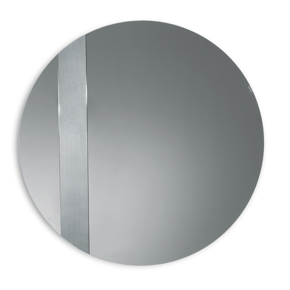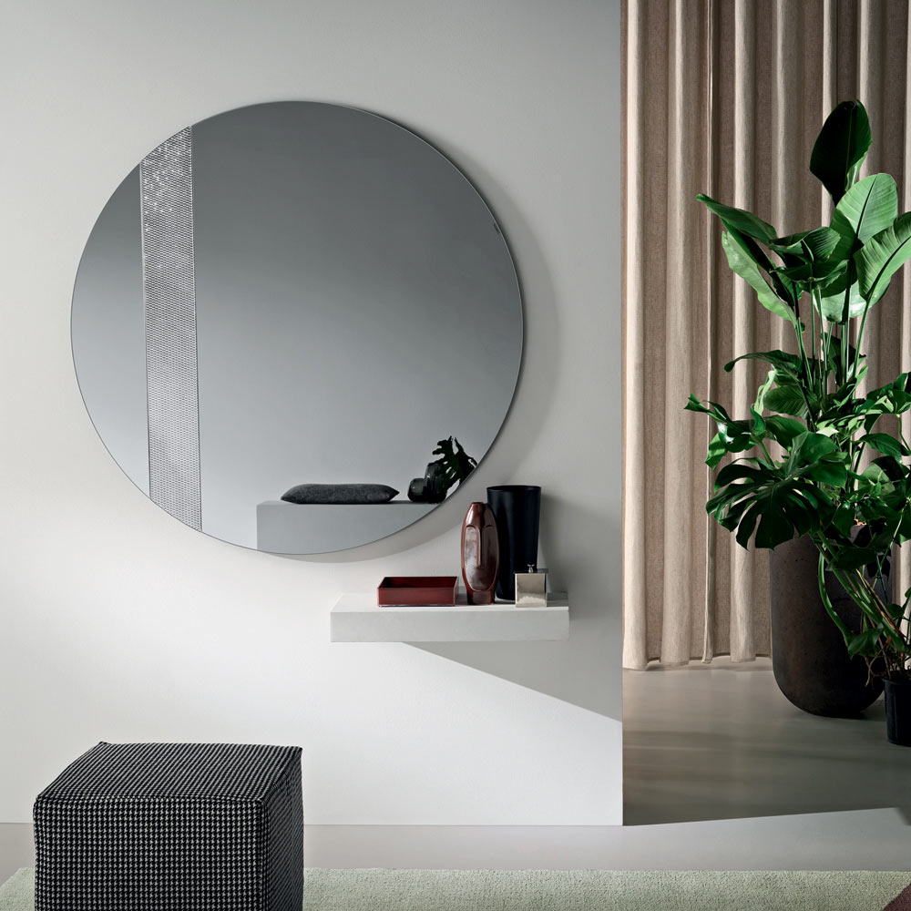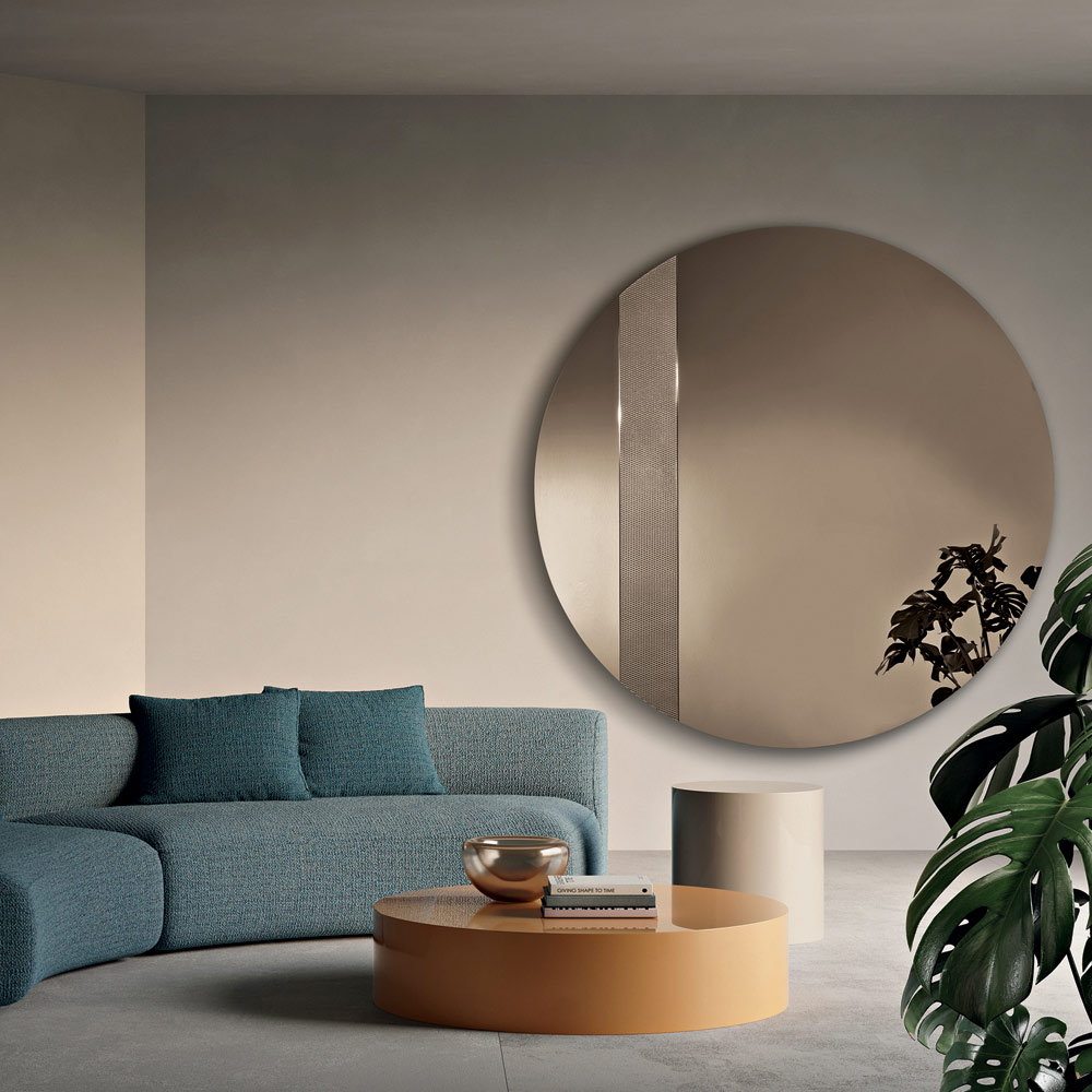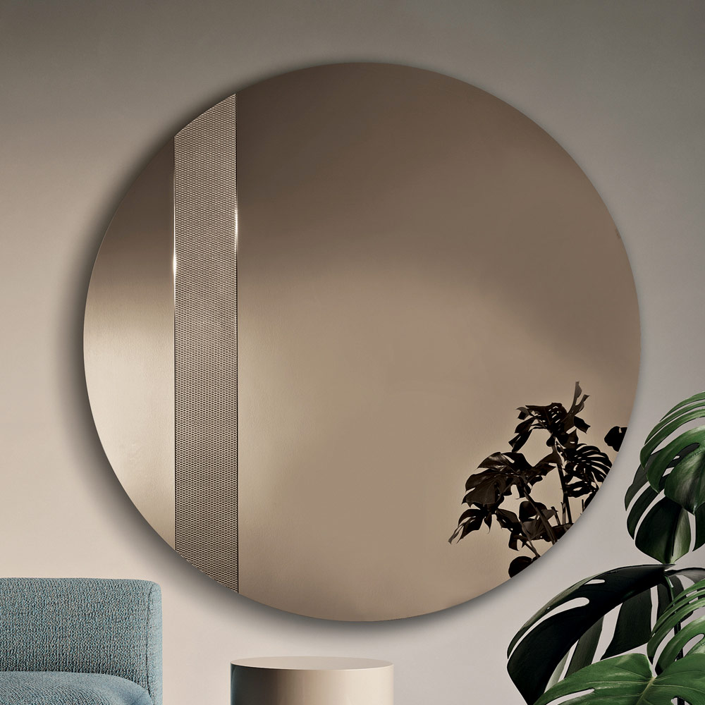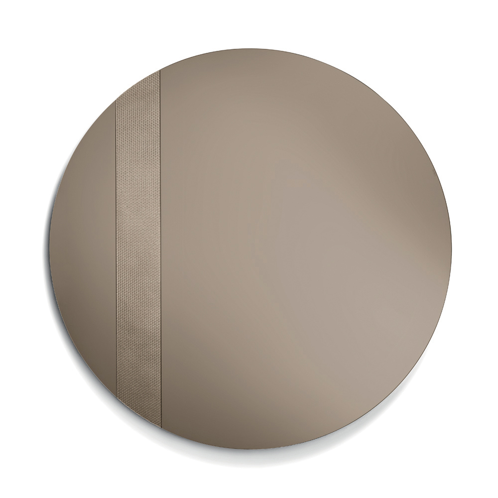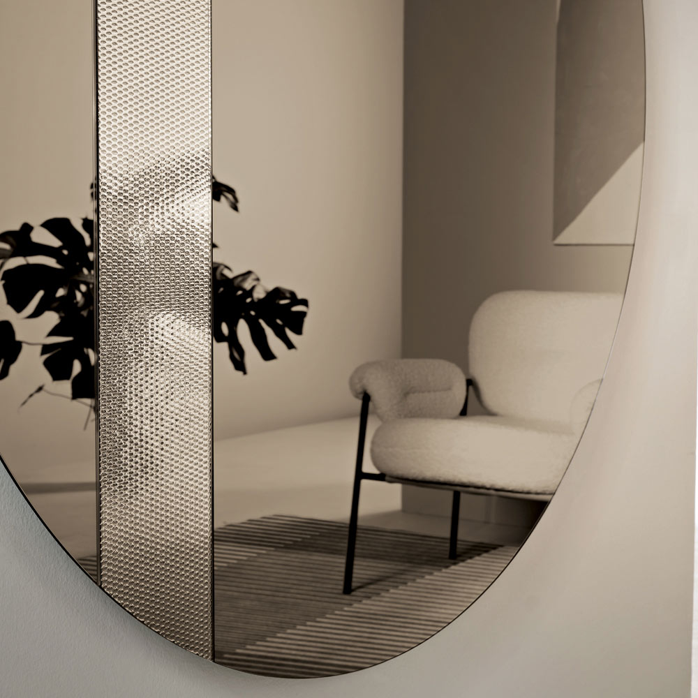 Der Spiegel besticht durch seine runde Form und einen seitlichen Glaseinsatz mit Ton-in-Ton-Netzdekor . Dieses grafische Detail fängt das Licht ein und erzeugt ein elegantes Reflexionsspiel, das der Spiegelfläche Tiefe und Dynamik verleiht.
