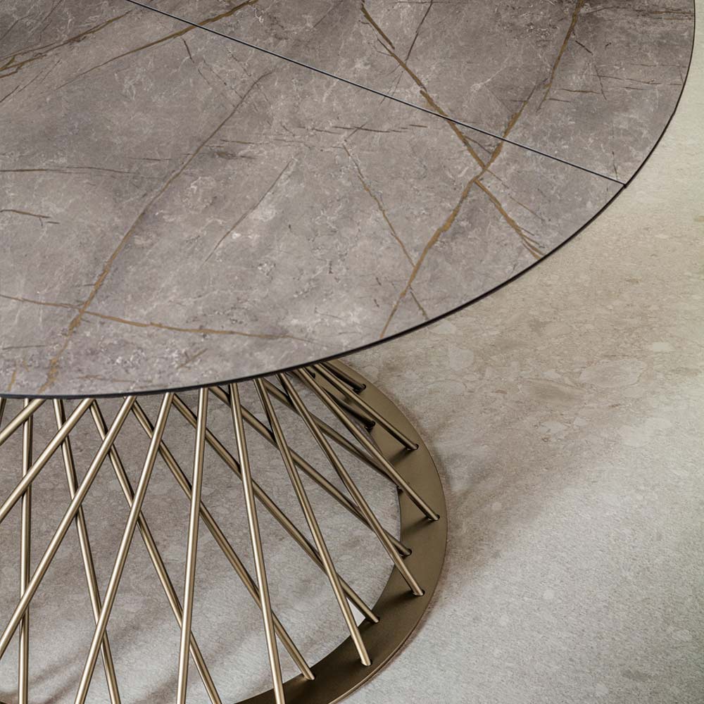 Der Sockel ist ein wahres Kunstwerk: aus lackiertem Metall mit einem Geflecht geometrischer Linien, das einen dynamischen und überraschenden Effekt erzeugt. Eine solide, aber optisch leichte Struktur, perfekt für moderne, elegante oder repräsentative Umgebungen.
