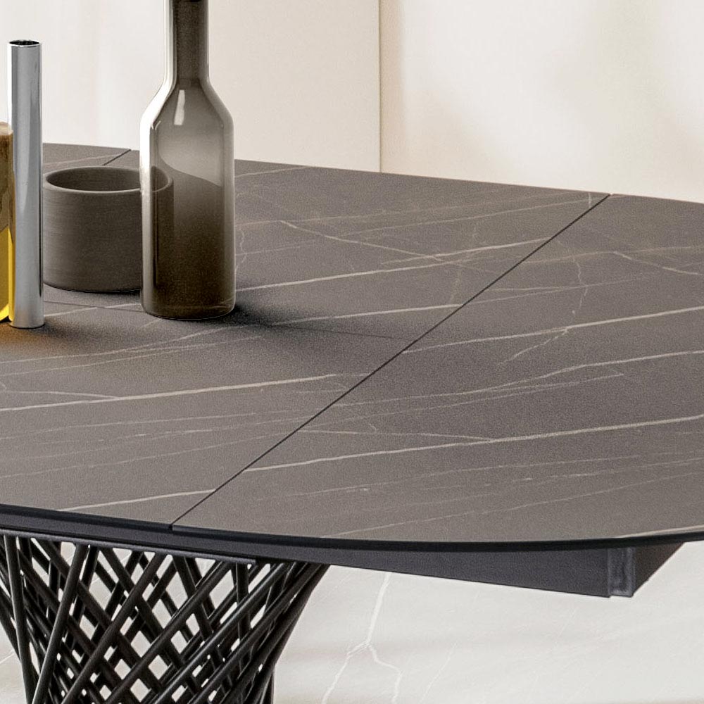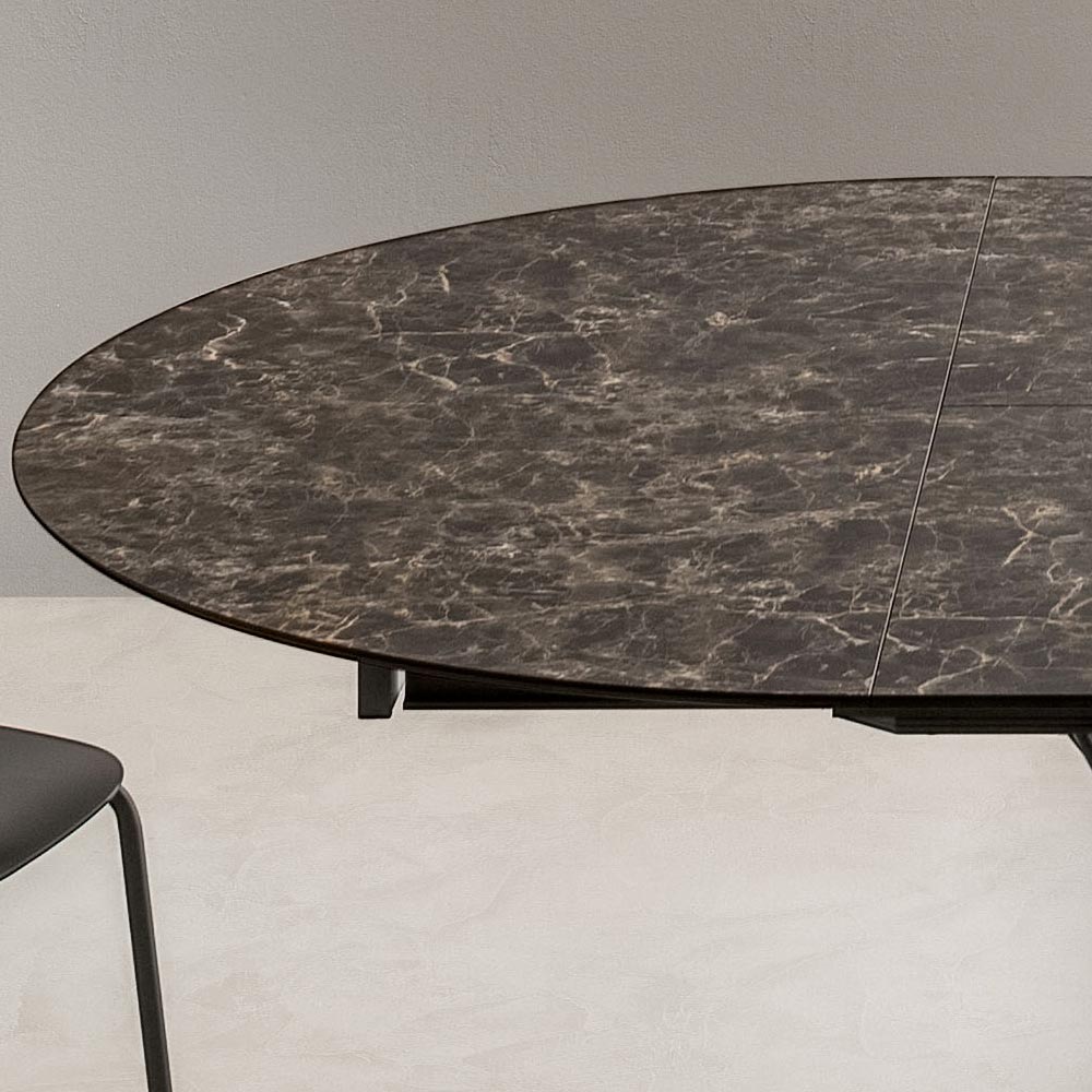 Die HPL- Platte besticht durch eine raffinierte Ästhetik mit eleganter Maserung und widerstandsfähigen Oberflächen. Der zentrale Ausziehmechanismus ist praktisch und diskret und ideal, um den Tisch mit wenigen Handgriffen umzubauen und bequem mehr Personen Platz zu bieten.