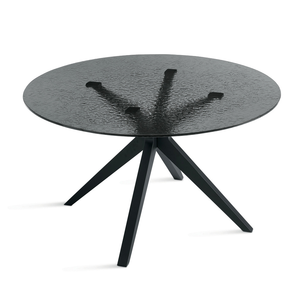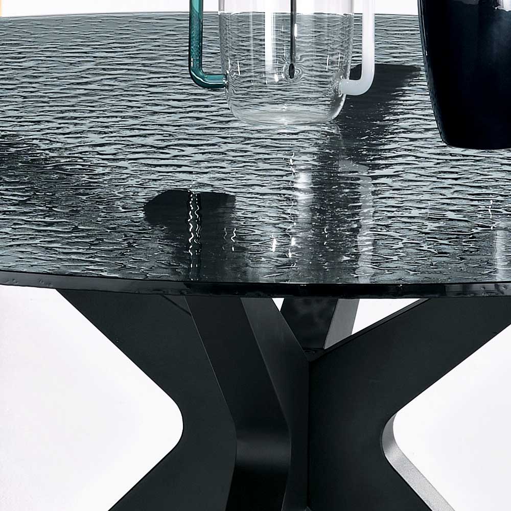 Ein eleganter runder Esstisch in modernem Design, der Ihrem Ess- oder Wohnzimmer eine stilvolle Note verleiht. Die Tischplatte besteht aus geräuchertem, gehämmertem Glas – eine edle Oberfläche, die eine einzigartige Textur erzeugt und dem Raum optische Tiefe verleiht.