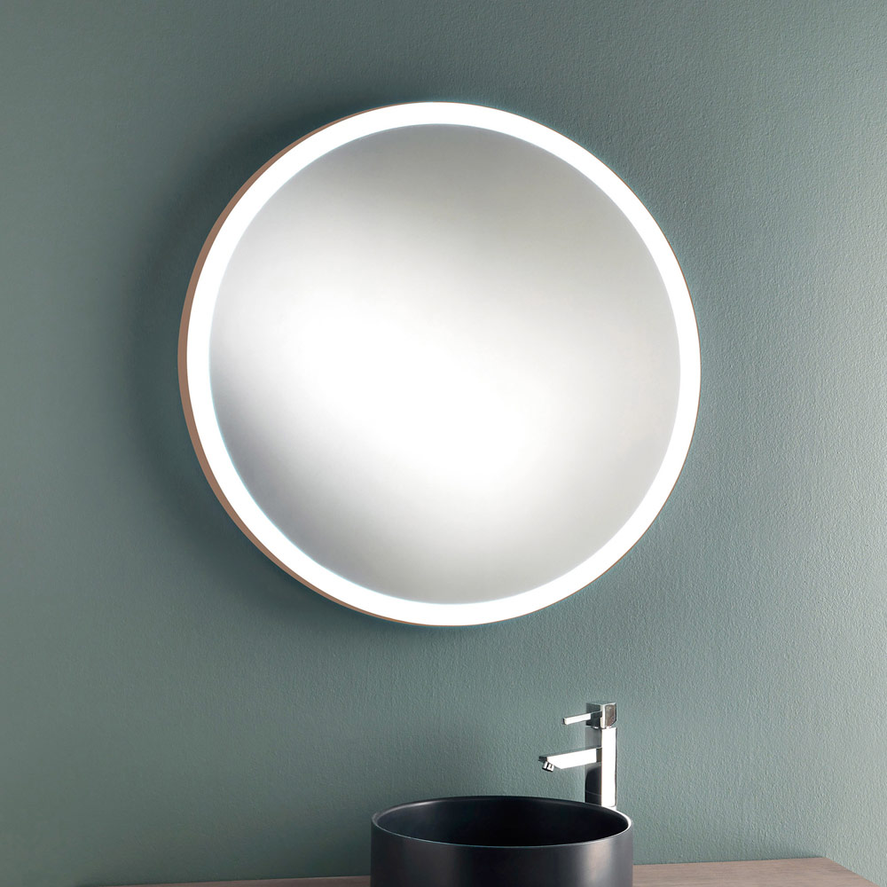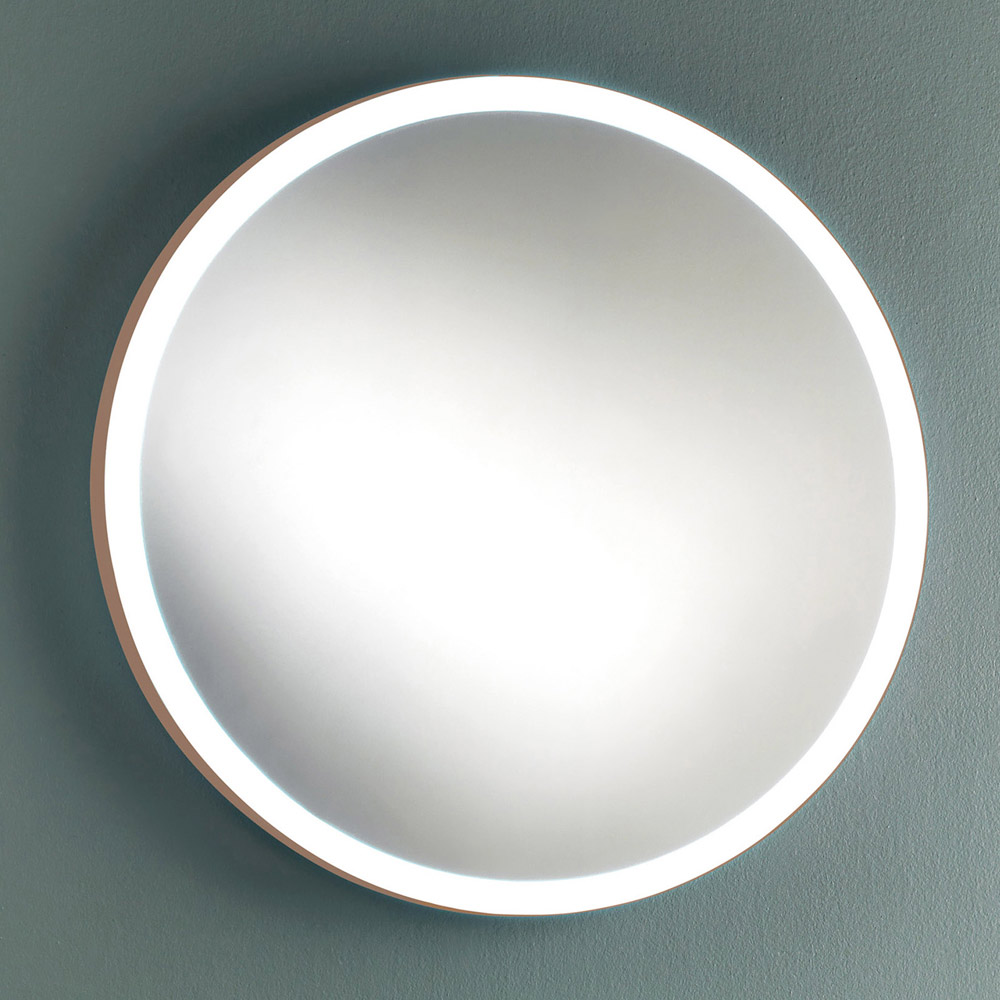 Runder Wandspiegel mit Kupfermetallrahmen und LED-Beleuchtung, hergestellt in Italien.
