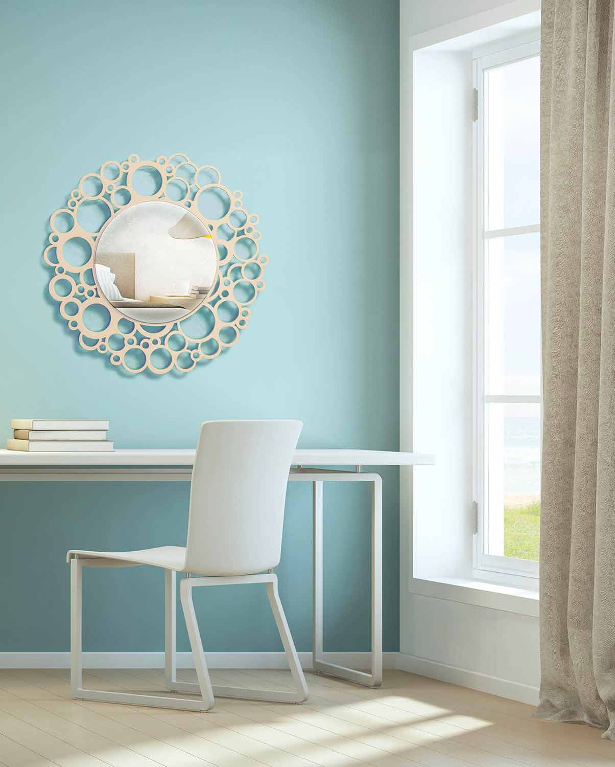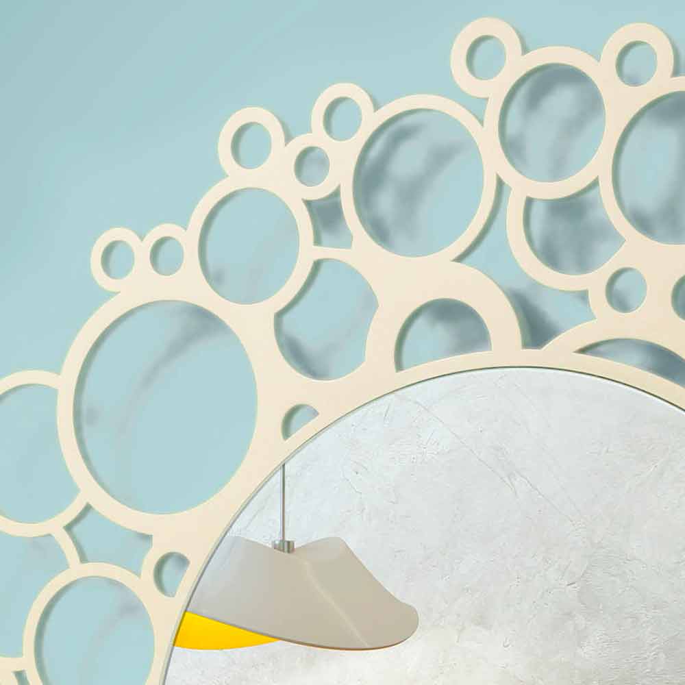 Kleiner runder Spiegel mit laserbearbeitetem lackiertem Holzrahmen . Es passt sich modernen Umgebungen mit minimalistischem Design an, z. B. Studios oder Arbeitsumgebungen.