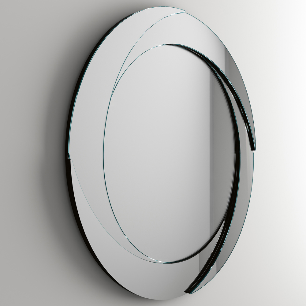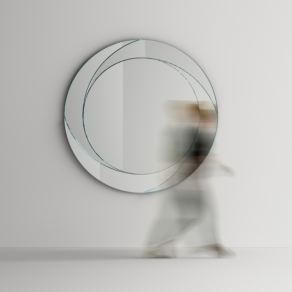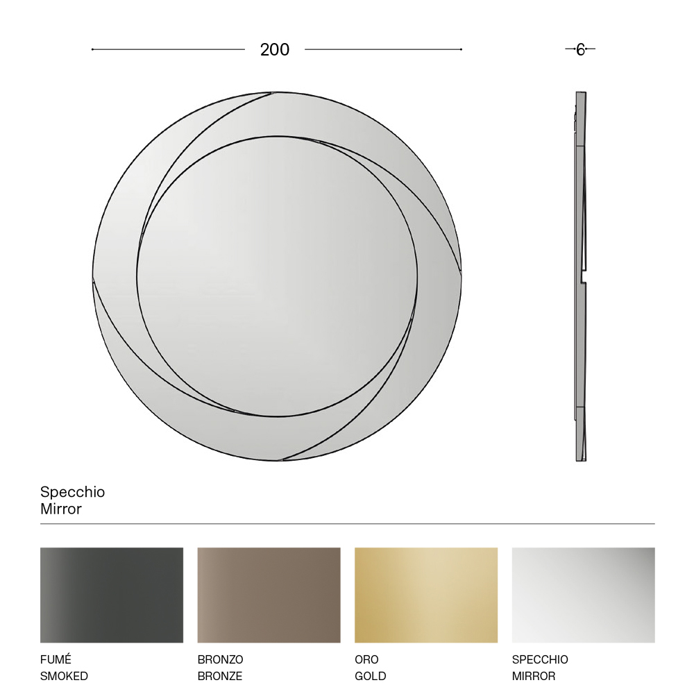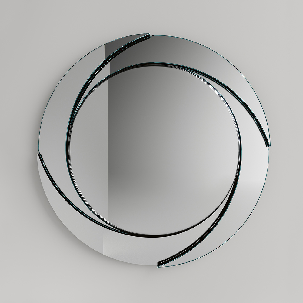 Wandspiegel mit schwarz lackierter Holzstruktur , rundem Mittelteil und schrägem Außenrahmen mit Prägedekor . Ein Möbelstück, das dank der Neigung der vier äußeren Elemente das minimale grafische Bild des Wirbels darstellt, die ein Spiel von Perspektiven schaffen , das das Bild dynamisch auf dem zentralen Spiegel reflektiert. Seine einfache, aber wirkungsvolle Ästhetik ist ideal für die Vervollständigung der Wände in jedem Bereich des Hauses, vom Eingang über das Wohnzimmer bis zum Schlafzimmer, und trägt gleichzeitig dazu bei, die Räume optisch für eine größere und hellere Umgebung zu vergrößern.