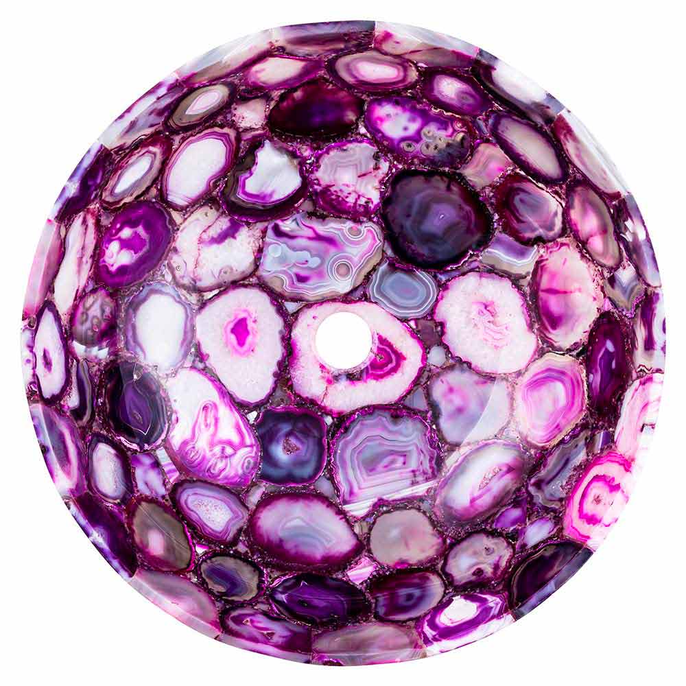 Buffalo ist ein farbenfrohesrundes Aufsatzwaschbecken aus Halbedelstein . Der Abgang ist durchscheinend.
