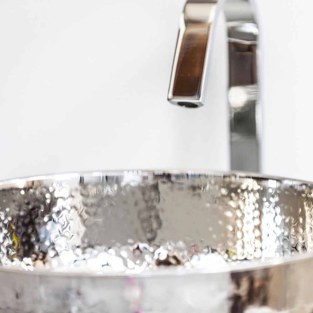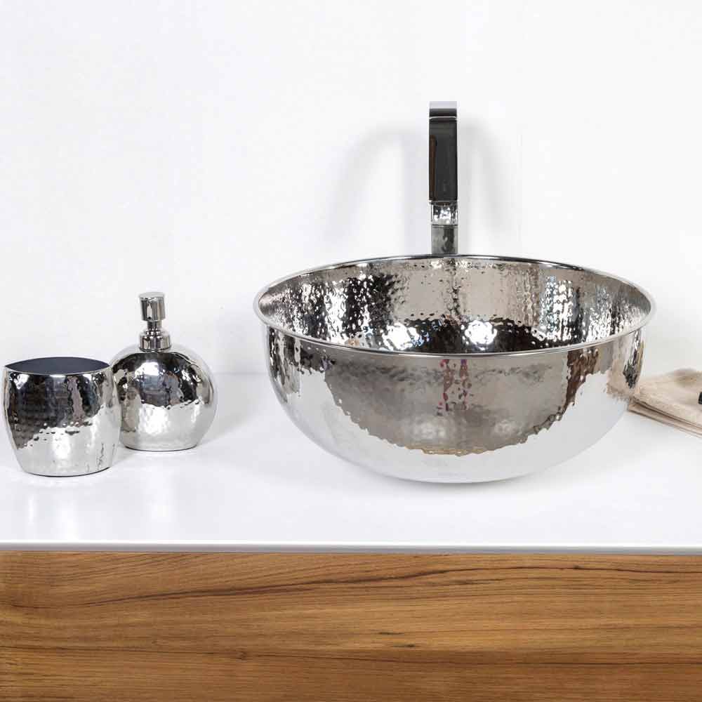 Modernes Waschbeckenaus gehämmertem verchromtem Messing . Der gewölbte obere Rand verleiht dem Waschtisch mehr Stabilität und Reinigungsfreundlichkeit.