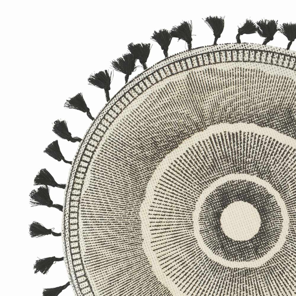Rundes Tischset aus weißer Jute mit schwarzen Fransen, 12-teilig.