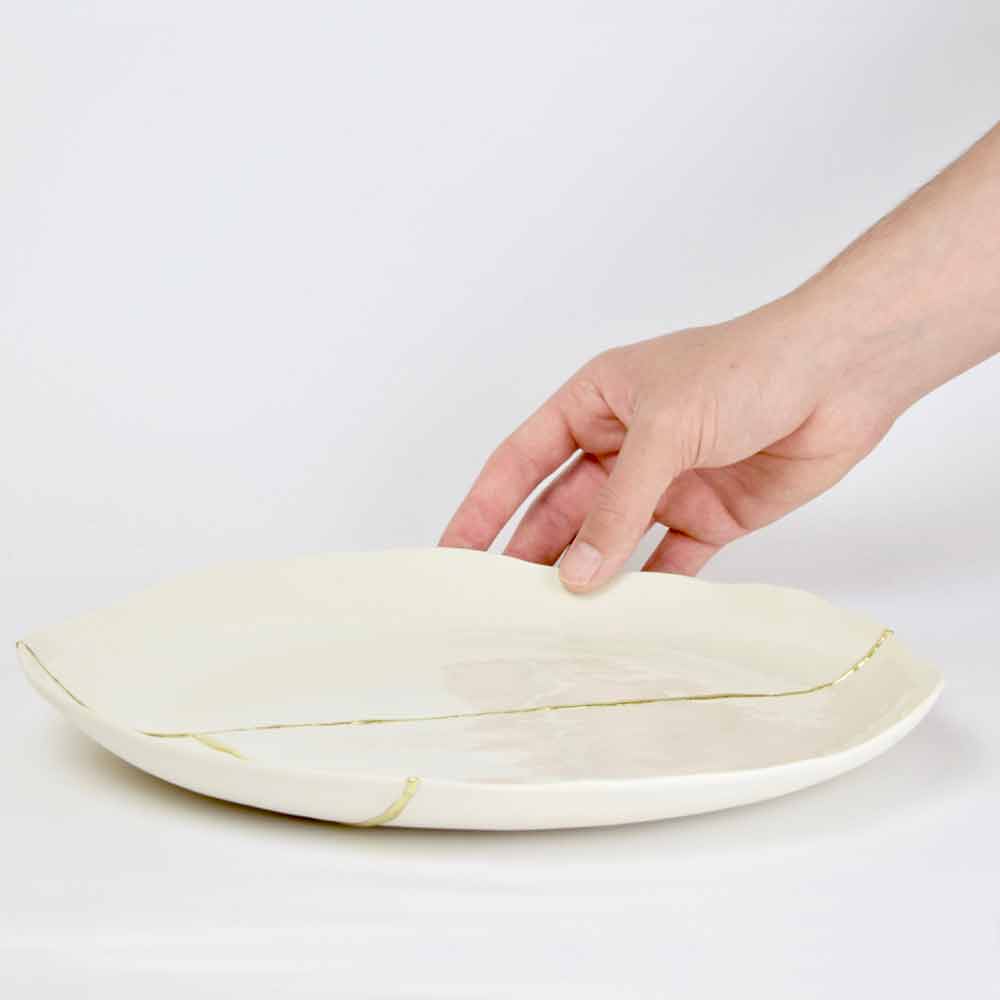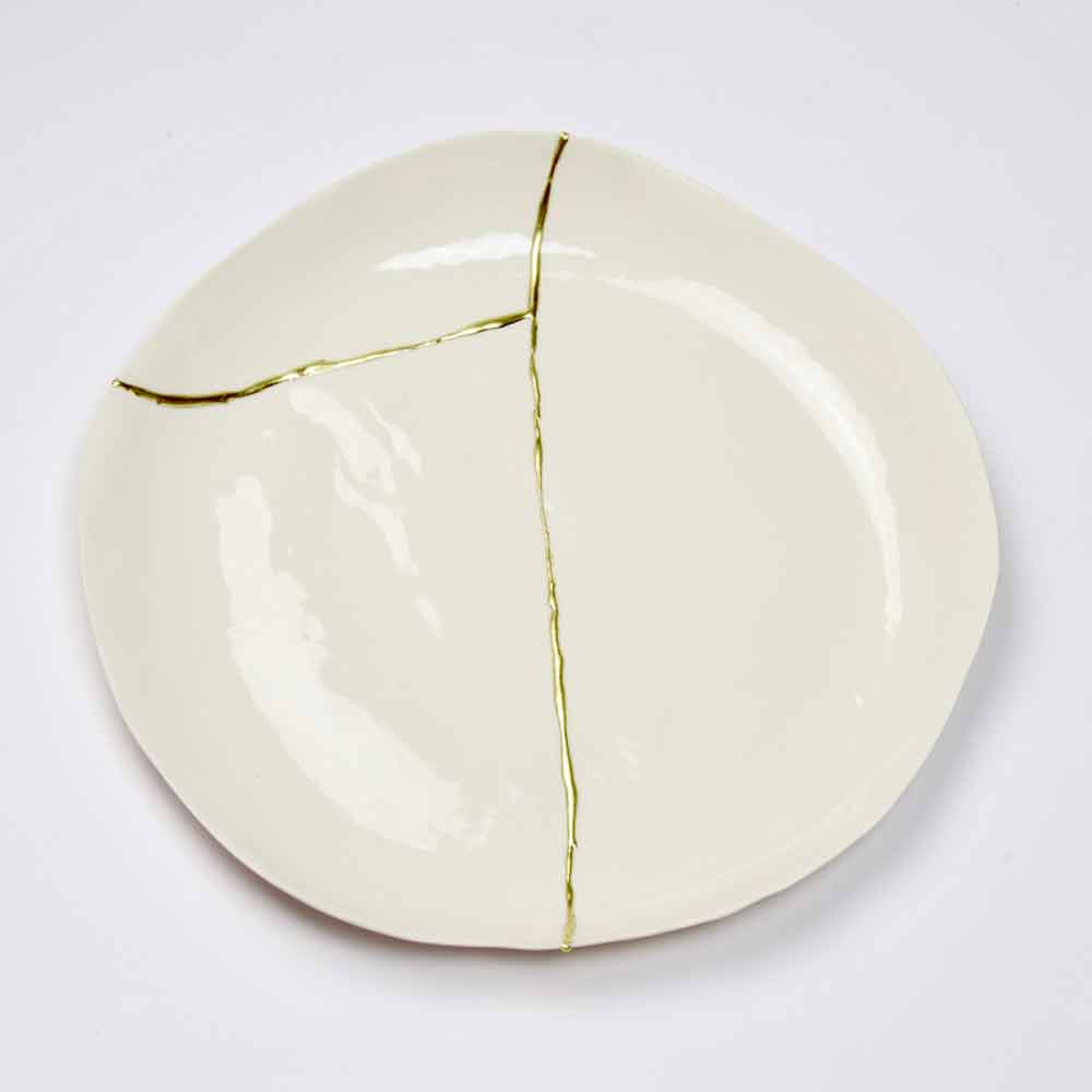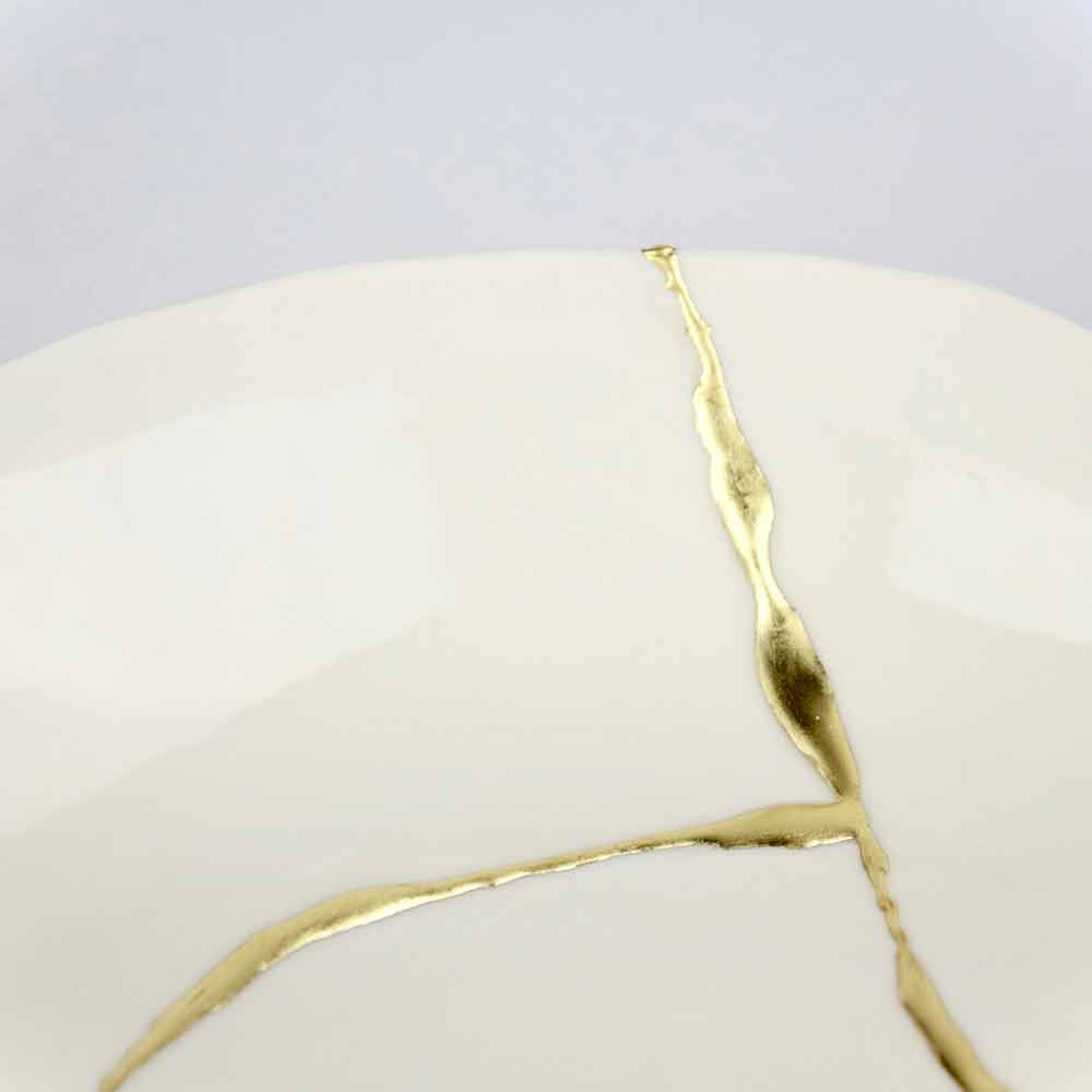 Dieses runde Münzfach aus feinstem weißem Porzellan greift die japanische Philosophie des Kintsugi auf, die darin besteht, die Wunden des Lebens zu verbessern, nicht zu verbergen, da sie Teil unserer Geschichte sind und dazu beitragen, uns zu den Menschen zu machen, die wir heute sind. So wird jedes Objekt, das beim Kochen im Ofen beschädigt herauskommt, mit 22-Karat- Blattgold als Klebstoff repariert, wodurch eine wunderbare, kostbare Narbe entsteht.