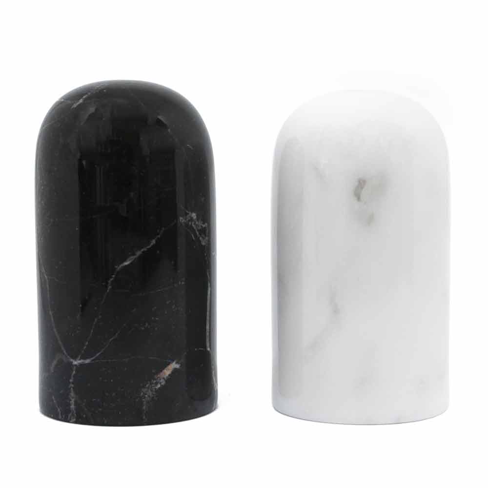Diese Küchenbehälter für Salz und Pfeffer zeichnen sich durch die Verwendung von weißem Carrara-Marmor und schwarzem Marquinia-Marmor aus und sind als Einzelstücke zu betrachten , da sich jeder verwendete Marmorblock in Adern und Schattierungen von den anderen unterscheidet. Der weiße Marmor stammt aus dem Steinbruch Poggio Silvestre, einer Quelle von Marmor erster Qualität, der seit dem letzten Jahrhundert klassifiziert wurde, während der schwarze Marquinia-Marmor aus spanischen Steinbrüchen gewonnen wird und sich durch seine unregelmäßigen weißen oder hellgrauen Adern auszeichnet, die dem Marmor ein Original verleihen moderner Look. Jedes Produkt wird auch von Fachleuten handgefertigt, die seit Generationen auf die Marmorverarbeitung spezialisiert sind.