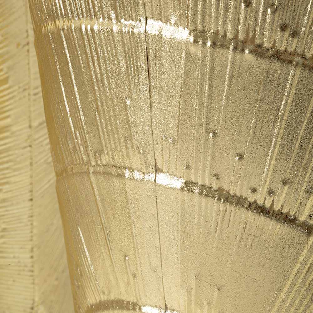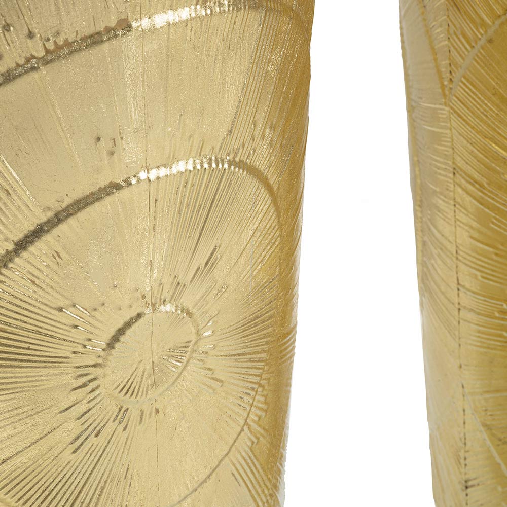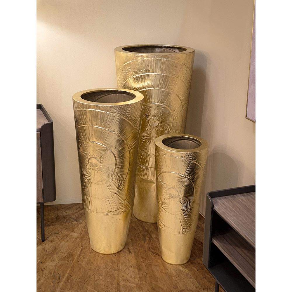 Diese dekorativen Vasen sind wahre Skulpturen, Kunstwerke, die den Blick auf sich ziehen und jede Umgebung elegant bereichern. Ihr Goldton erzeugt einen warmen und einladenden visuellen Effekt, während die in das Eisen eingravierten Linien einen strahlenden Effekt erzeugen, der der glatten Oberfläche der Vasen Bewegung und Leben verleiht.