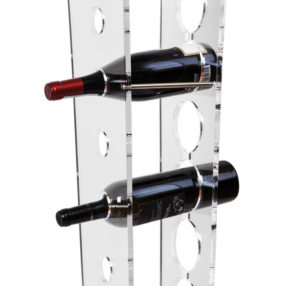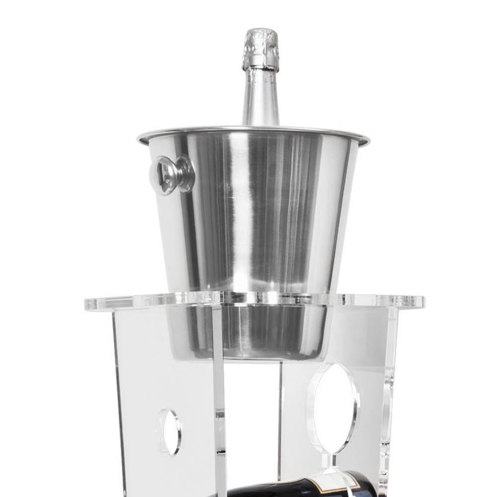 Der freistehende Weinflaschenhalter zeichnet sich durch ein elegantes Design auf Rädern komplett aus transparentem Acrylglas aus. Elegant und funktional, kann es bis zu 6 Flaschen aufnehmen und endet mit dem Loch für den Eiskübel für ein komplettes Design.