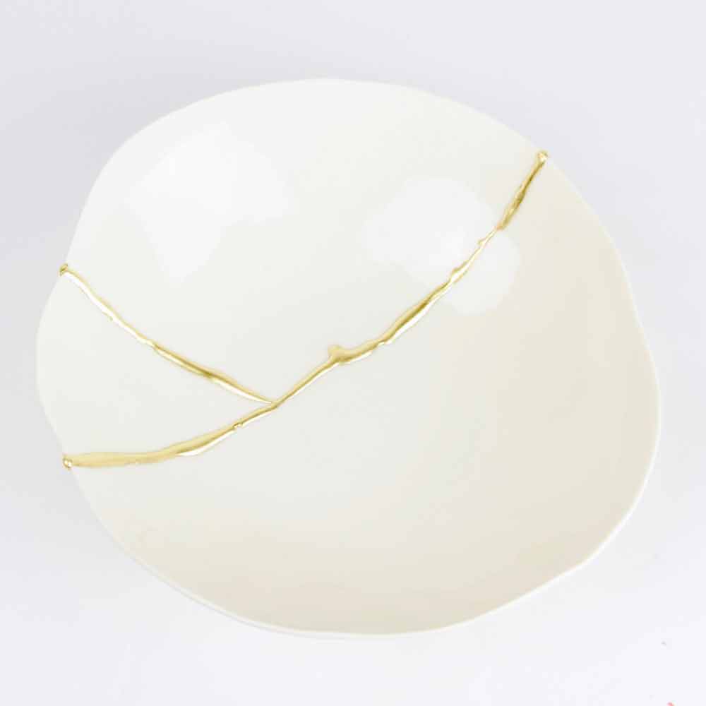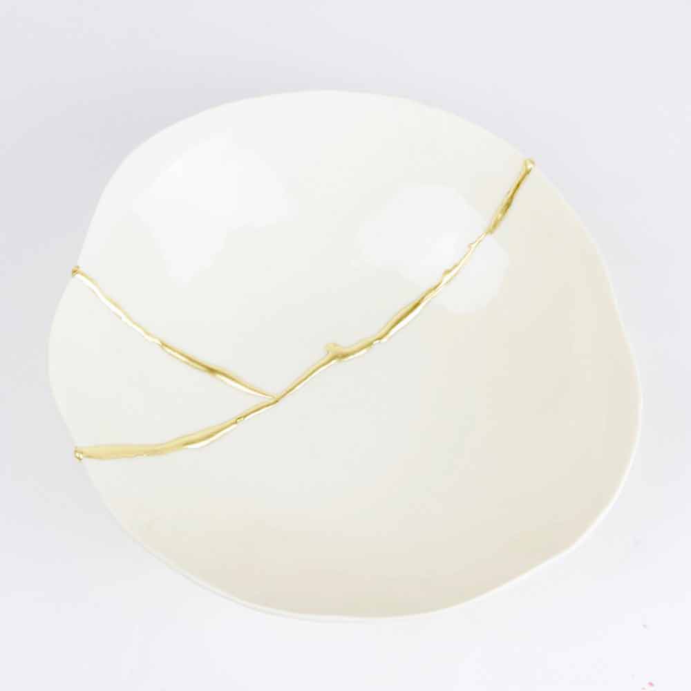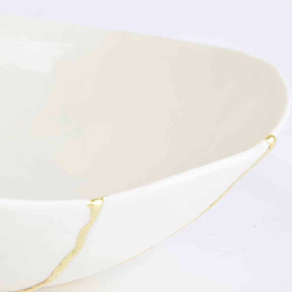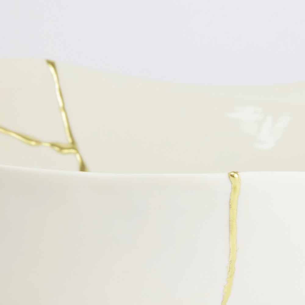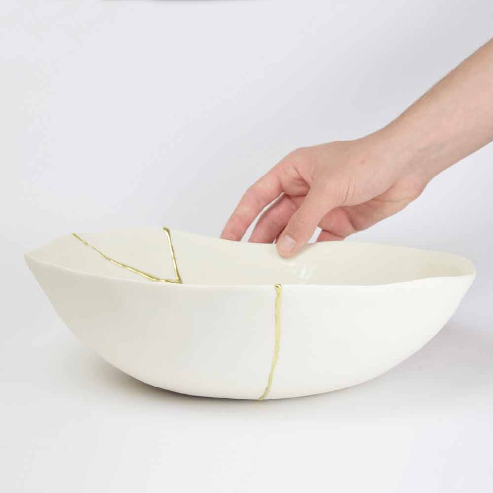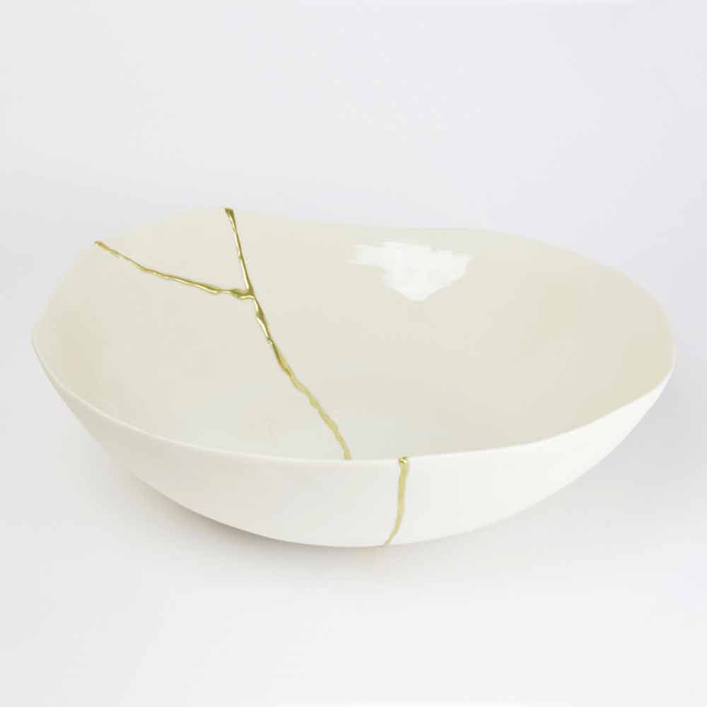 Diese Schalen aus feinstem weißem Porzellan spiegeln die japanische Philosophie des Kintsugi wider, die darin besteht, die Wunden des Lebens zu verbessern, nicht zu verbergen, da sie Teil unserer Geschichte sind und dazu beitragen, uns zu den Menschen zu machen, die wir heute sind. So wird jedes Objekt, das beim Kochen im Ofen beschädigt herauskommt, mit 22-Karat- Blattgold als Klebstoff repariert, wodurch eine wunderbare, kostbare Narbe entsteht.