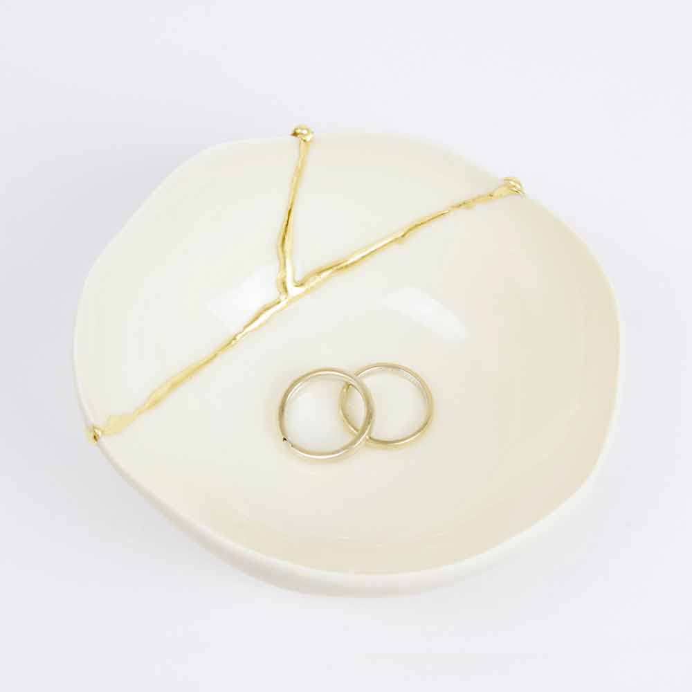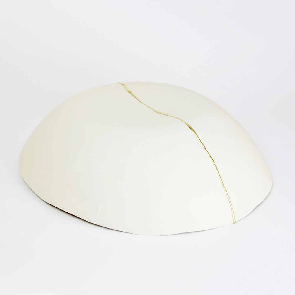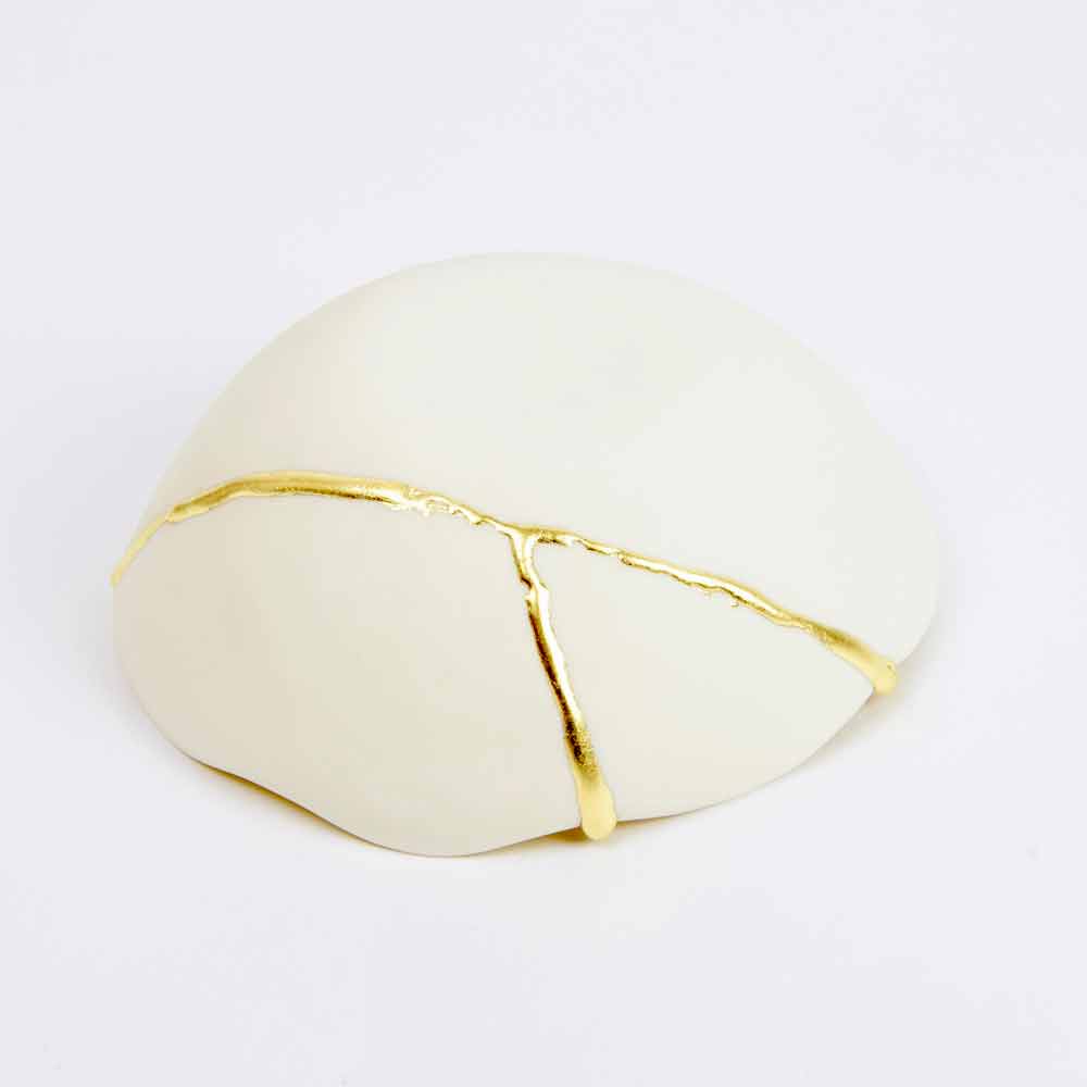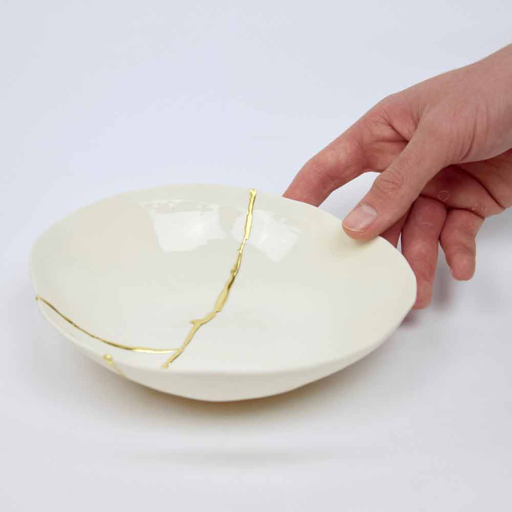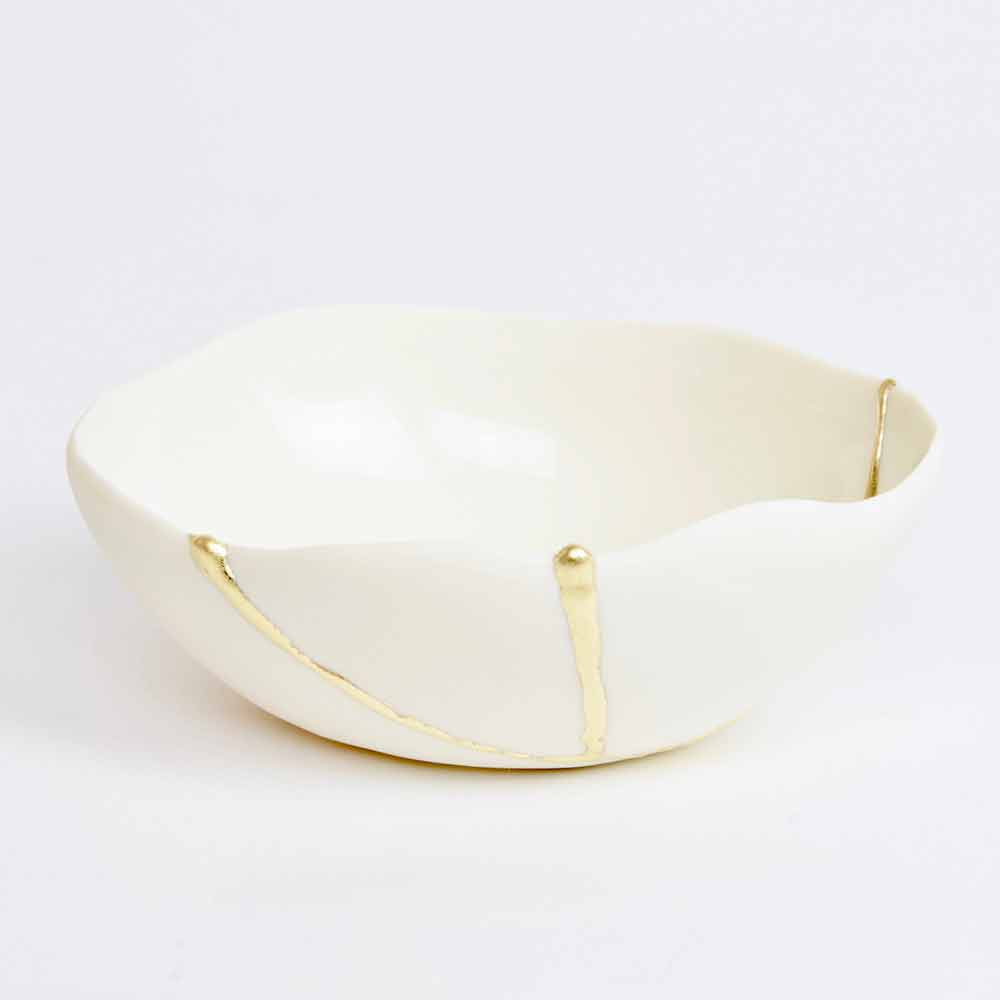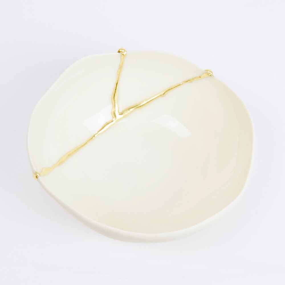 Diese Schalen aus feinstem weißem Porzellan spiegeln die japanische Philosophie des Kintsugi wider, die darin besteht, die Wunden des Lebens zu verbessern, nicht zu verbergen, da sie Teil unserer Geschichte sind und dazu beitragen, uns zu den Menschen zu machen, die wir heute sind. So wird jedes Objekt, das beim Kochen im Ofen beschädigt herauskommt, mit 22-Karat- Blattgold als Klebstoff repariert, wodurch eine wunderbare, kostbare Narbe entsteht.