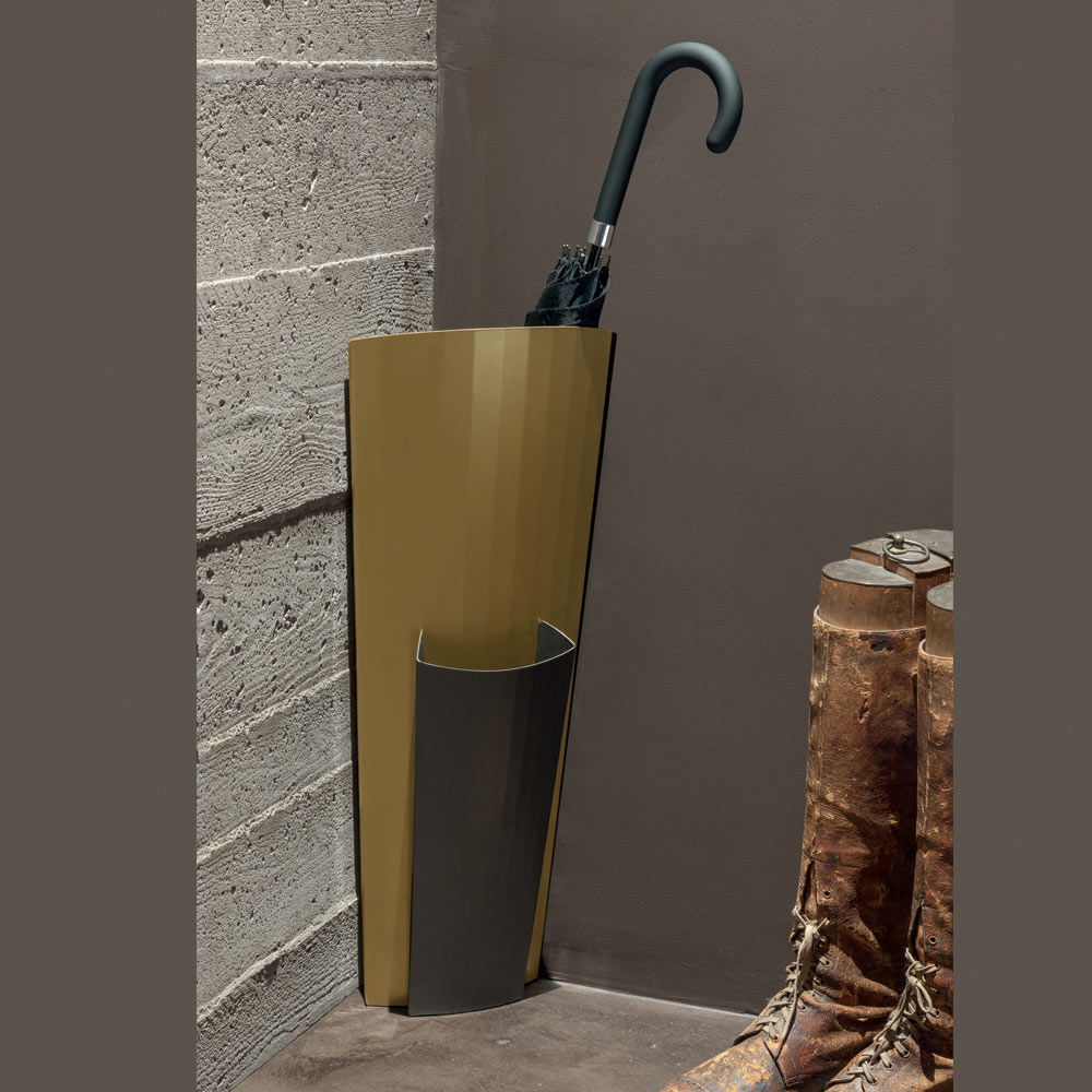 Schirmständer aus geprägtem, gold- und bronzefarben lackiertem Blech , vollständig in Italien hergestellt. Schirmständer mit originellem und funktionalem Design. Die Struktur aus schwarz und gold lackiertem Blech ist mit einer facettierten Verarbeitung verziert, die an eine elegante Falte erinnert. Dieser Schirmständer erfüllt nicht nur seine Hauptfunktion effektiv, sondern verleiht dem Eingang Ihres Zuhauses oder Büros dank seines unverwechselbaren Designs und der hochwertigen Materialien, die bei seiner Konstruktion verwendet wurden, auch einen Hauch von Eleganz und Stil