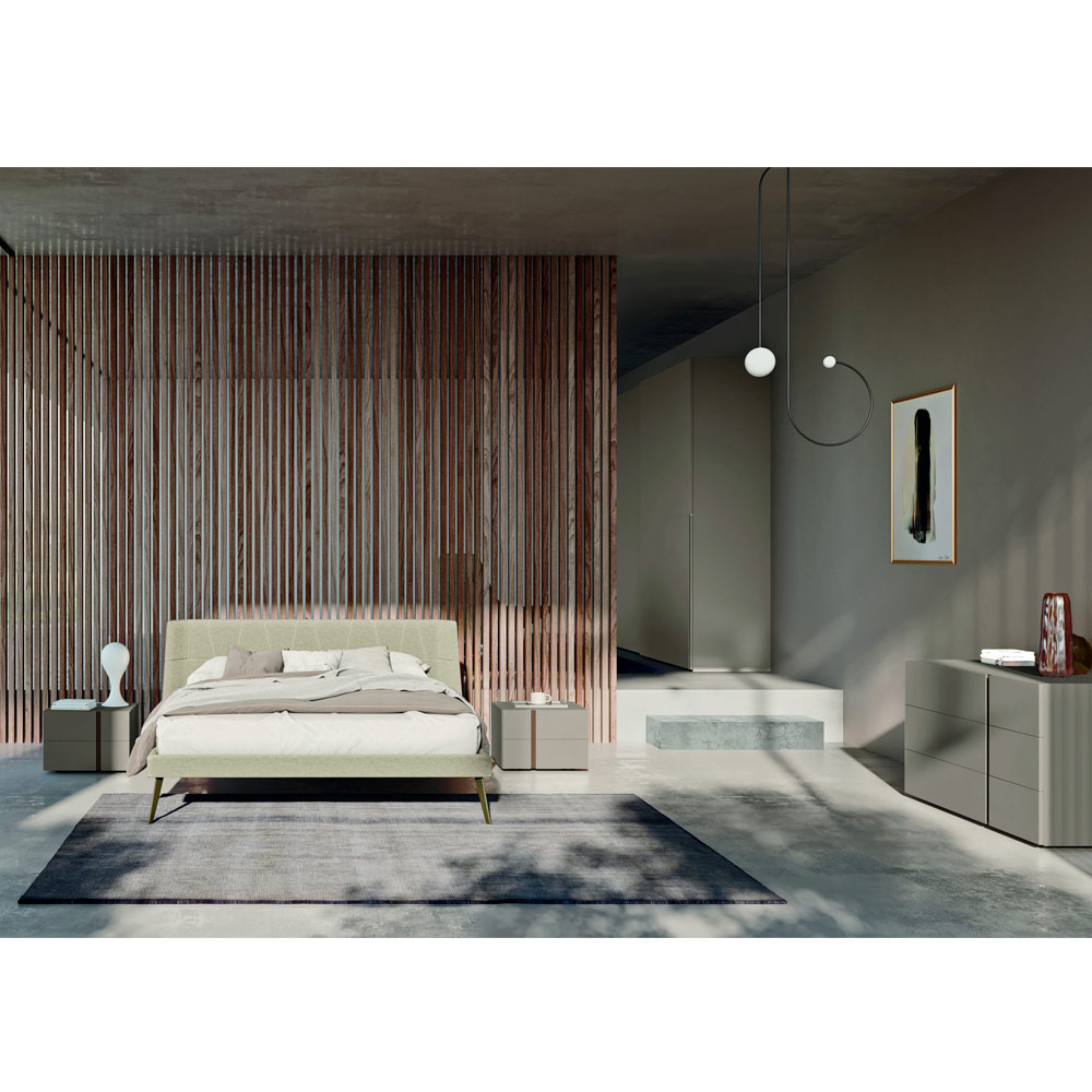 Komplette Schlafzimmermöbel mit 4 Elementen komplett made in Italy . Die Komposition umfasst ein Doppelbett mit Bettrahmen aus Holz und Kopfteil komplett mit Stoff bezogen und Füße aus brüniertem Metall , zwei Nachttische mit je 2 Schubladen und eine Kommode mit 3 Schubladen aus Terracotta und matt Terra lackiertem Holz mit Öffnung durch eine praktische Nut positioniert an der Schubladenfront. Die Besonderheit stellt die ungewöhnliche Form des Kopfteils dar, das sich nach innen schließt und das Gefühl eines beruhigenden Rückzugs vermittelt, und wird auch durch das raffinierte Design, das durch die Nähte auf der Oberseite entsteht, verschönert. Zusammen mit den Nachttischen und der Kommode erhält die Atmosphäre einen eleganten und formalen Charakter , der durch die frischen Farbnuancen des Stoffes heruntergespielt wird. Das Ergebnis ist eine Komposition für die nächtliche Umgebung, die jeden Raum auf exklusive und raffinierte Weise mit einem modernen Stil vervollständigen kann.