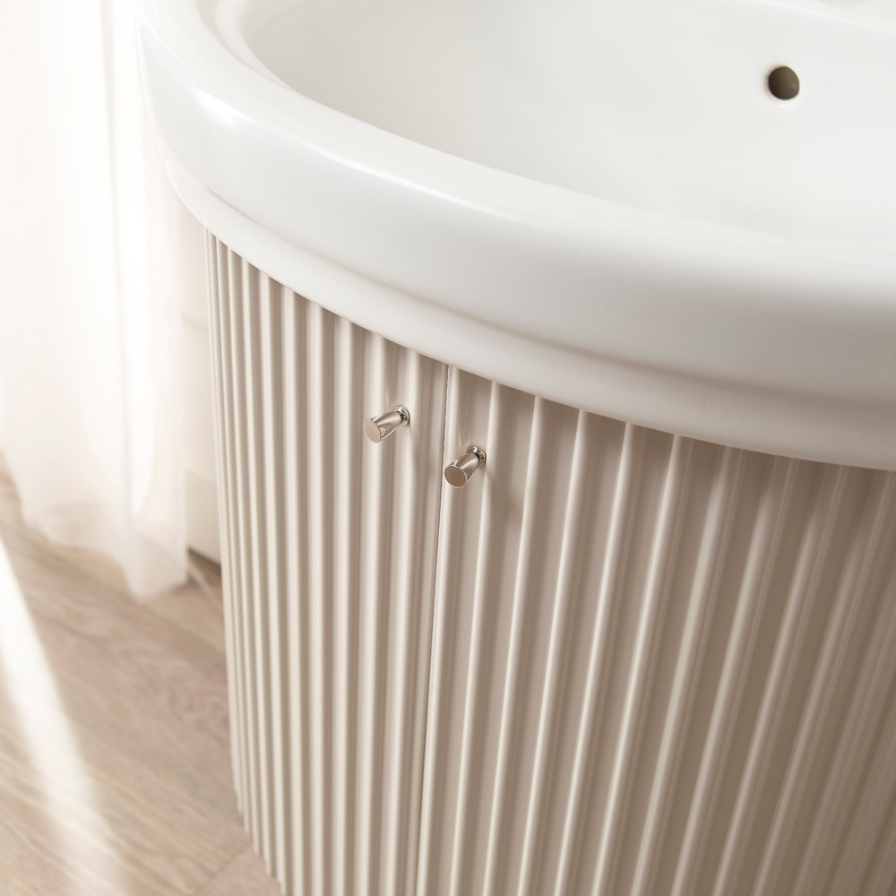 Badezimmerschrank aus MDF mit zwei Türenin Cannetté-Verarbeitung , mattes Finish, ein Regal aus MDF Idro, komplett mit Keramikwaschbecken und Nickelknöpfen , inklusive mattweißer MDF-Beine .
