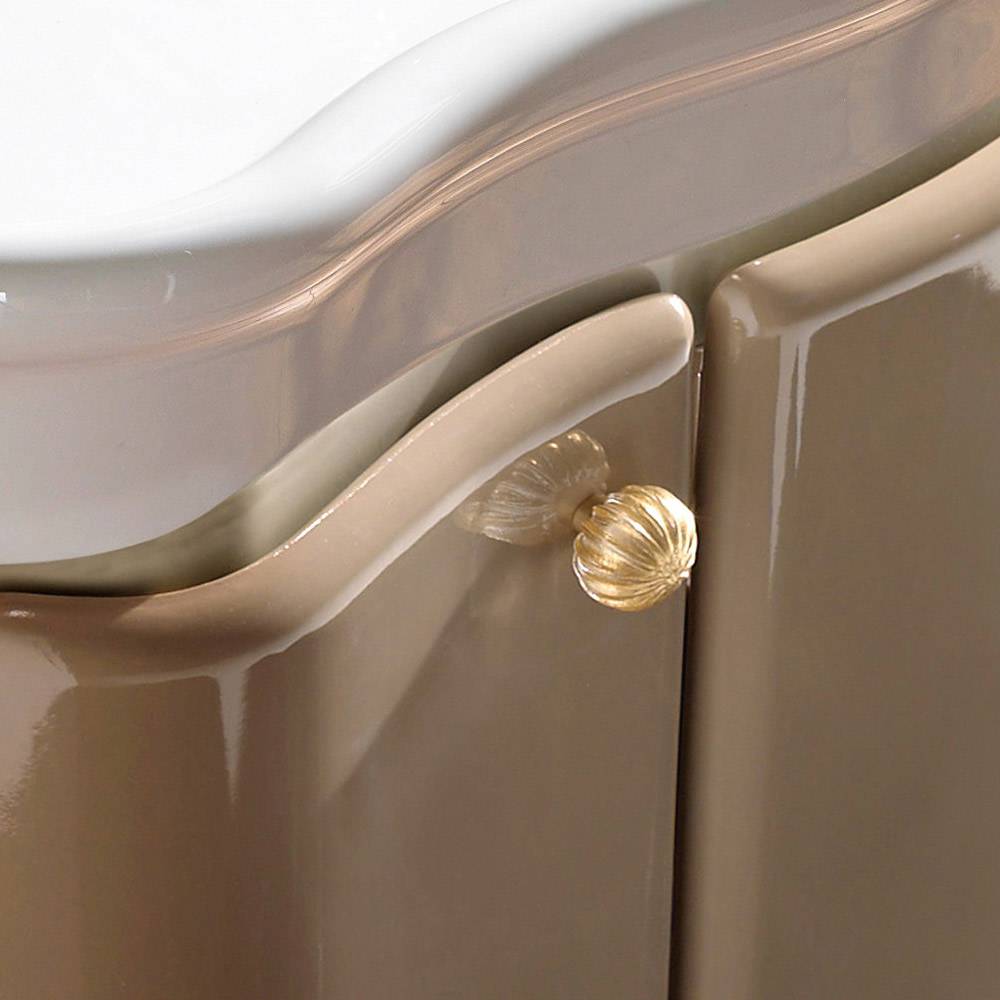 Badezimmerschrank aus MDF mit zwei Türen und einer zweifarbig karamellglänzend lackierten Schublade mit elfenbeinfarbener Struktur , mit weißem Keramikwaschbecken.Messingknöpfe und Waschbecken sind im Lieferumfang enthalten.