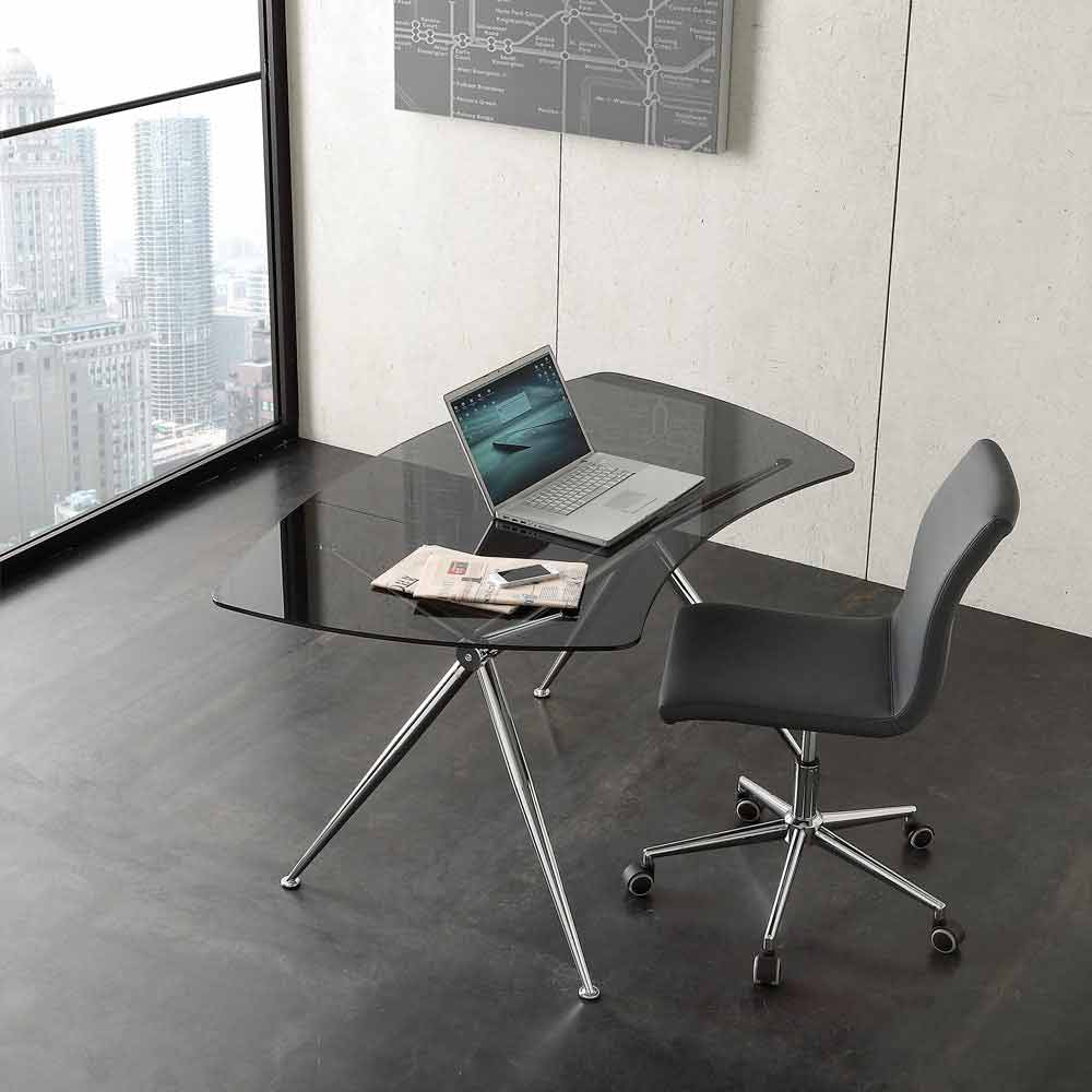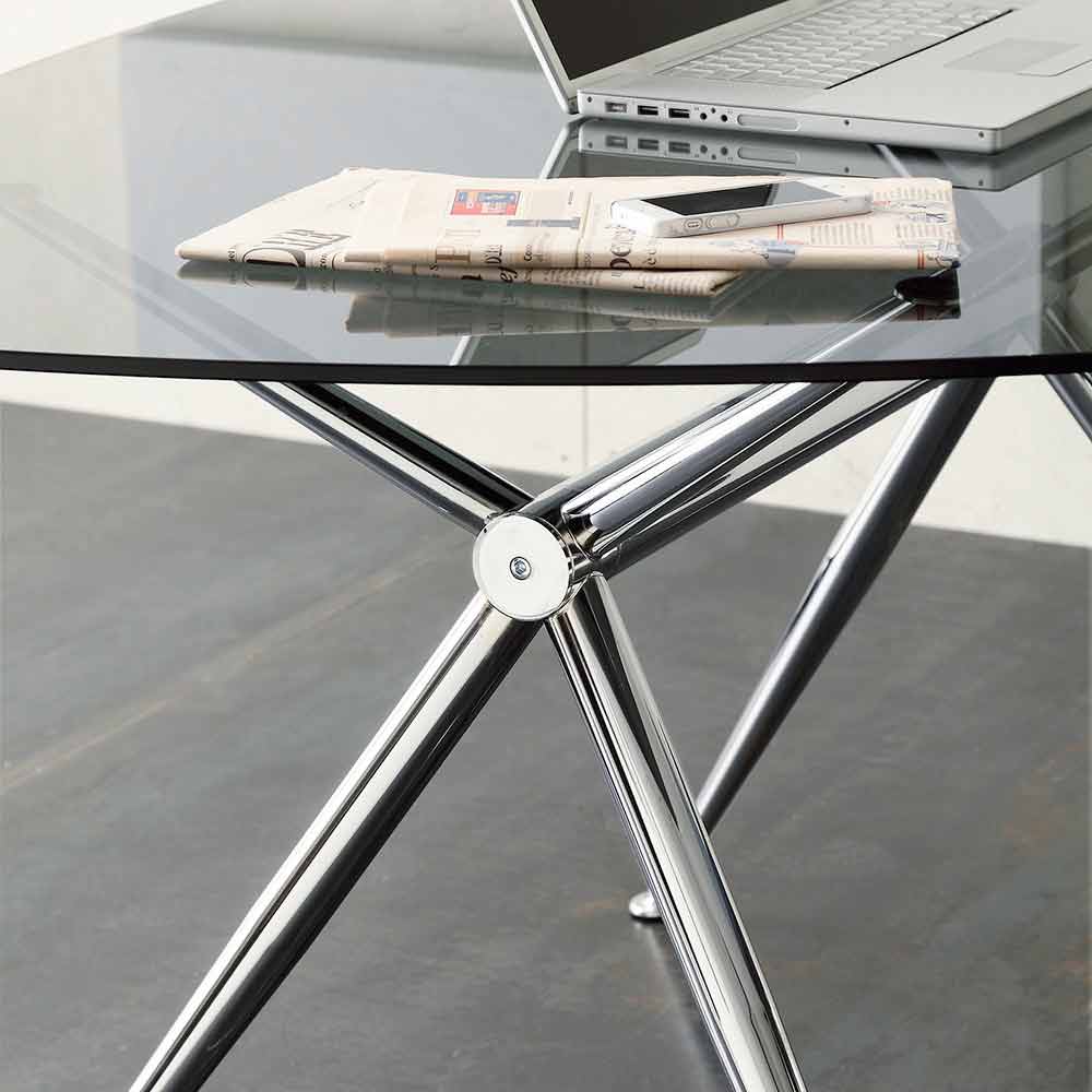 Schreibtisch aus Italien mit geformter Glasplatte (10 mm dick) und verchromter Metallstruktur .