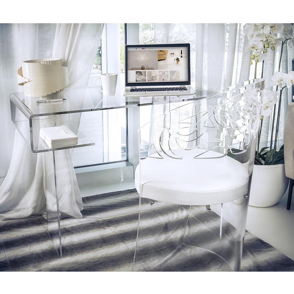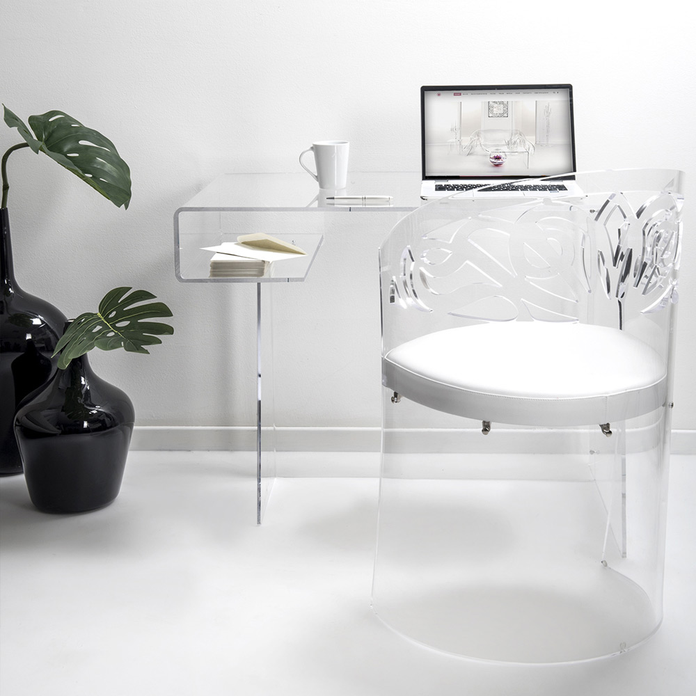 Schreibtisch im praktischen Design komplett aus PMMA-Plexiglas 100 % aus jungfräulichem Polymer in klarer Ausführung. Dieses Möbelstück wurde für diejenigen entworfen, die eine einfache und unverzichtbare Ablagefläche zum Lernen oder Arbeiten von zu Hause aus benötigen; es fungiert gleichzeitig als modernes , schlichtes und hochfunktionales Möbelstück , das in der Lage ist , die umliegenden Möbel mit Persönlichkeit und Geschmack zu bereichern .