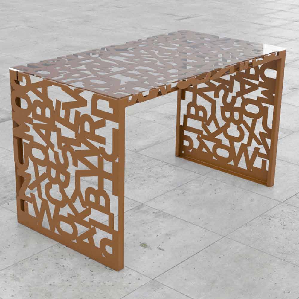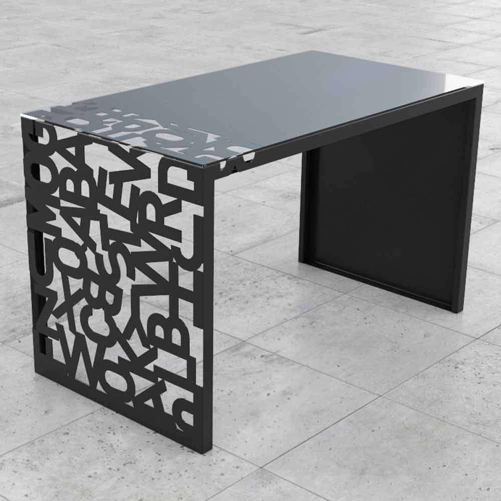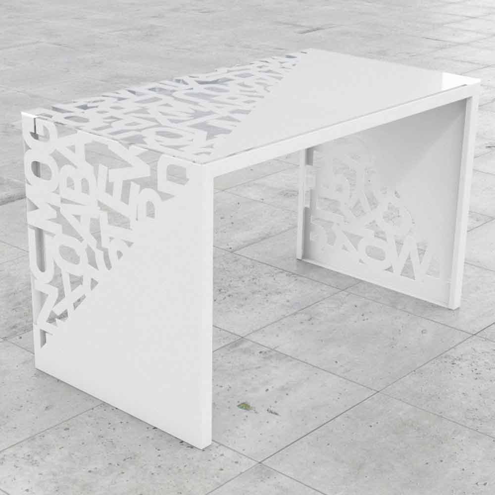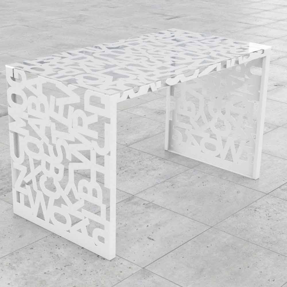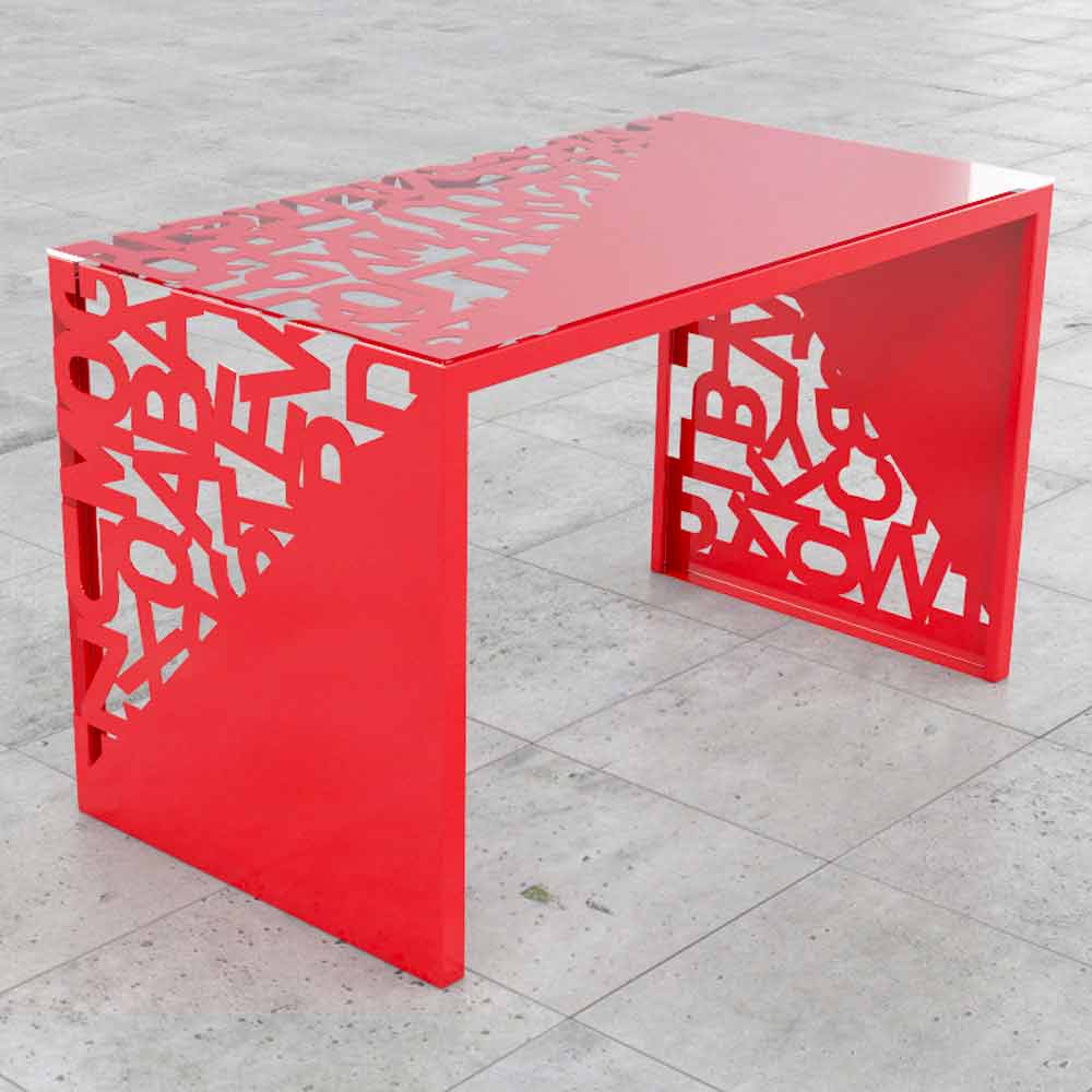 Kattedra entsteht aus einem einzigen Metallblech gebogen und mit Laserschneiden gestickt, eine originale Oberfläche voller Buchstaben. ein Tisch vom moderne Design, nicht nur optisch ansprechend, sondern auch sehr funktionell, dank der gehärtetem Glas Oberfläche. Ein Möbelstück, perfekt für Arbeit, Kinderzimmer oder Büro. Kattedra ist erhältlich in Schwarz, Weiß, Rot und Anthrazit Farbe.