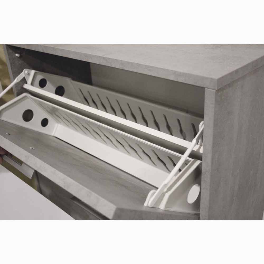 Der Schuhschrank ist aus melaminbeschichteten Spanplatten hergestellt in der Auführung Zement.