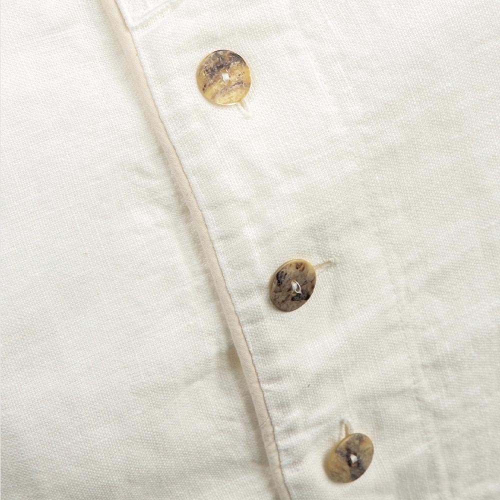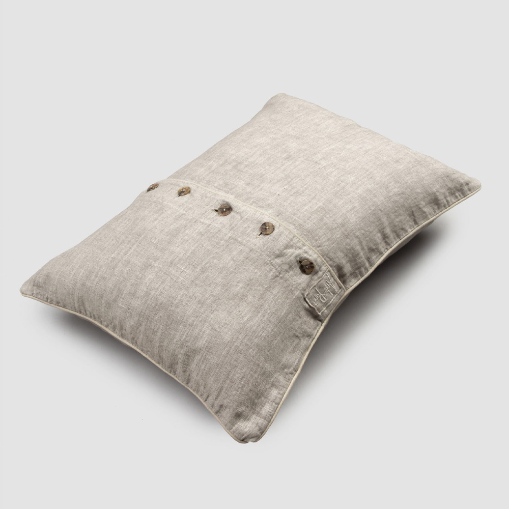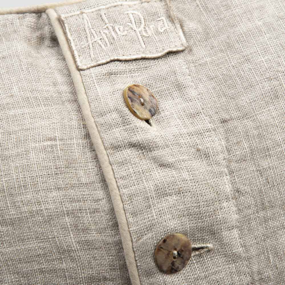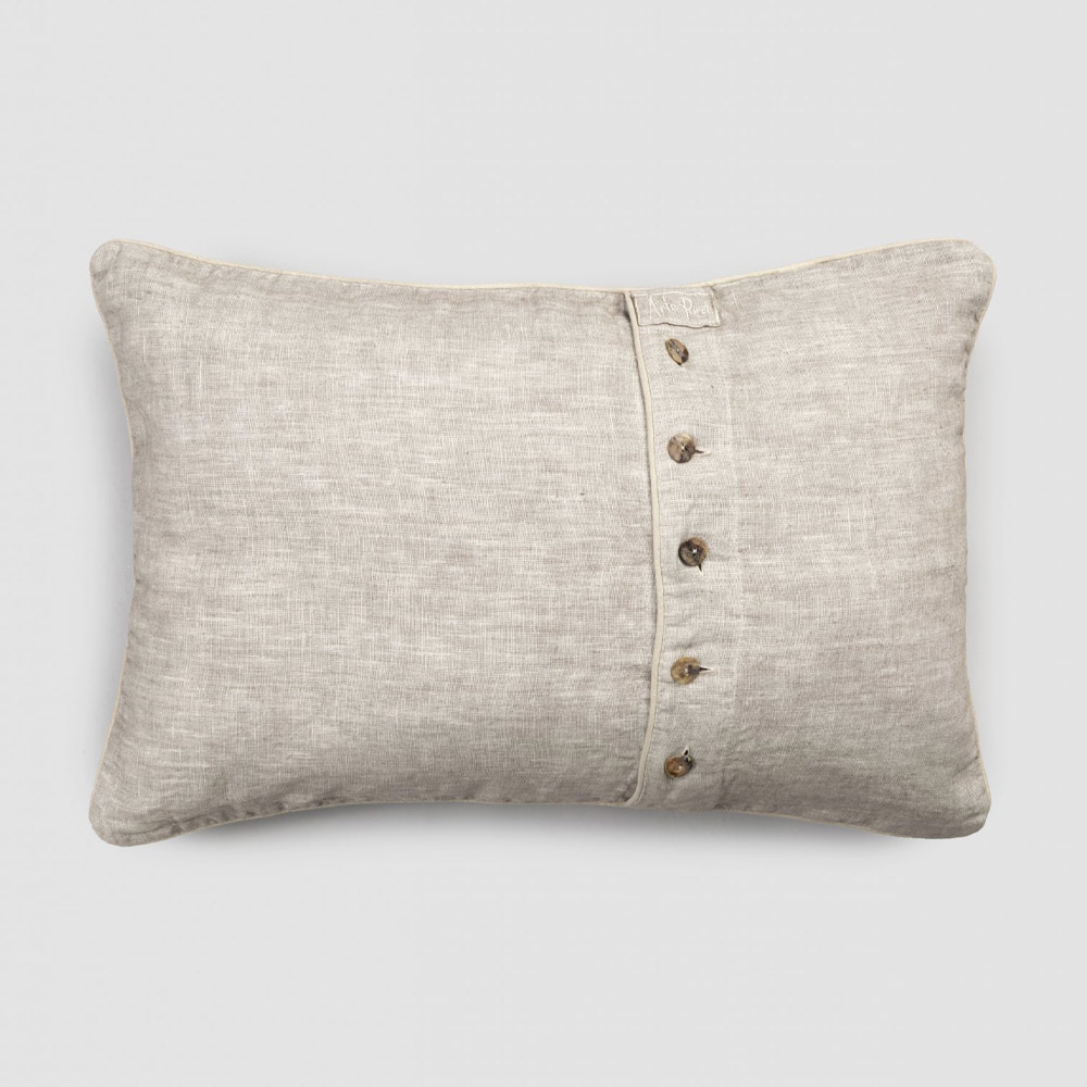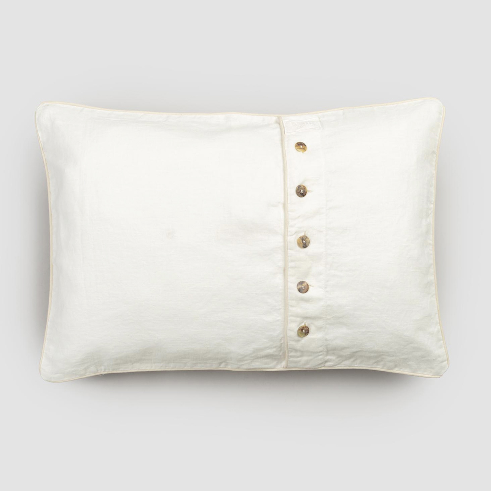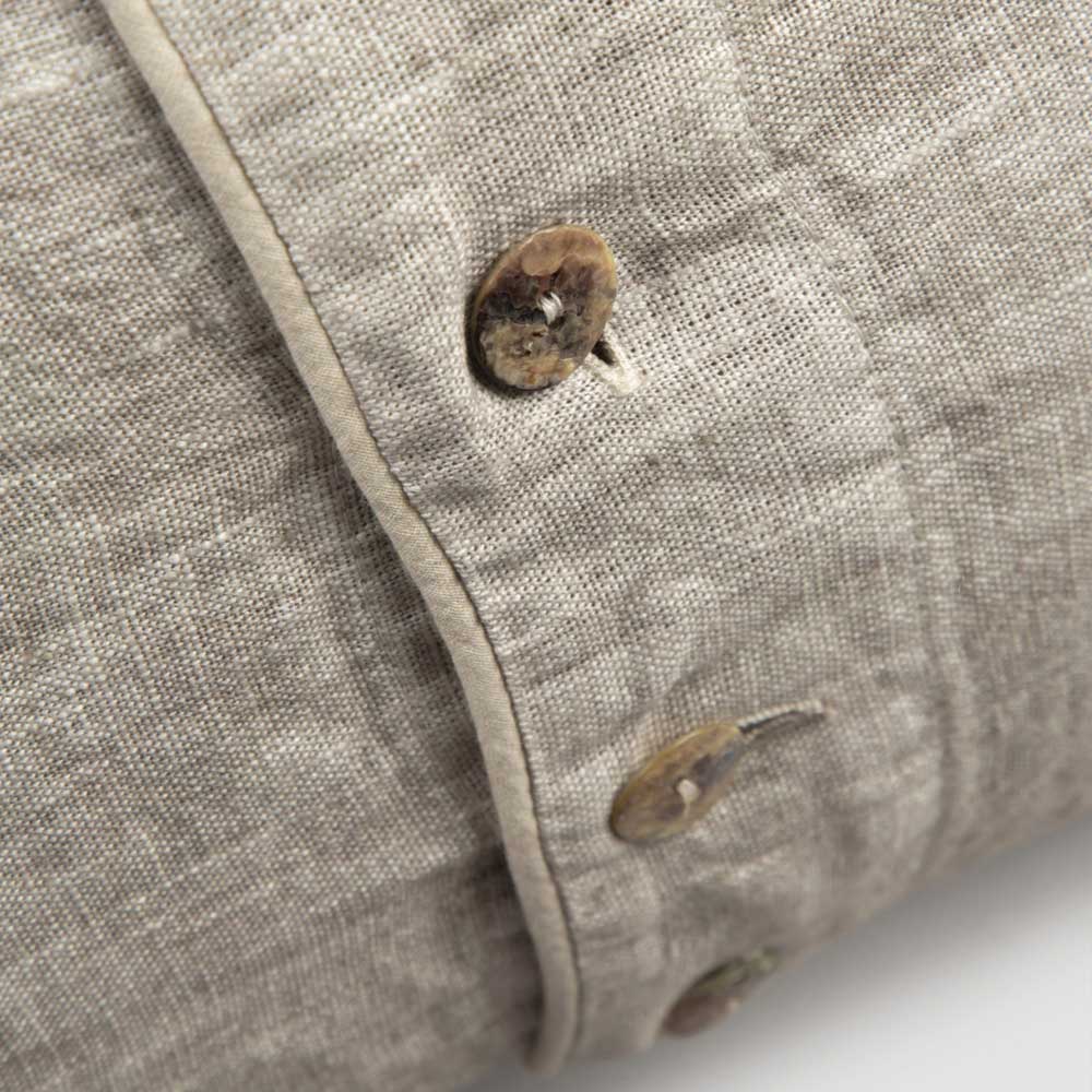 Der Wert der Tradition verbindet den modernen Lebensstil mit diesem Leinen-Kissenbezug , der mit einer zentralen Reihe von Agoya-Perlmuttknöpfen und einem Paspelprofil verziert ist.