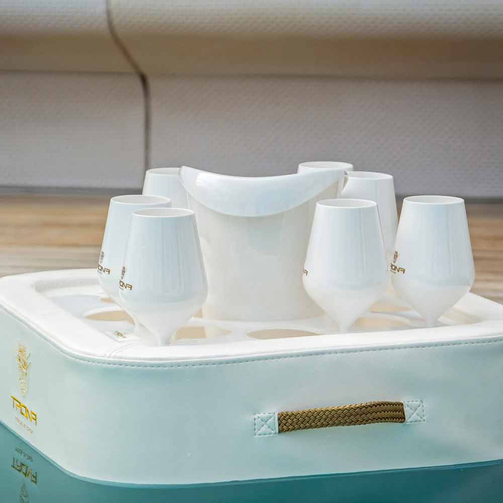 Komplett mit Eiswürfelbecher und ein Trinkbecher Set bestehend aus 8 Polycarbonat Sektbecher. Der Tisch kann sowohl im Pool als auch außerhalb des Pooles verwendet werden.