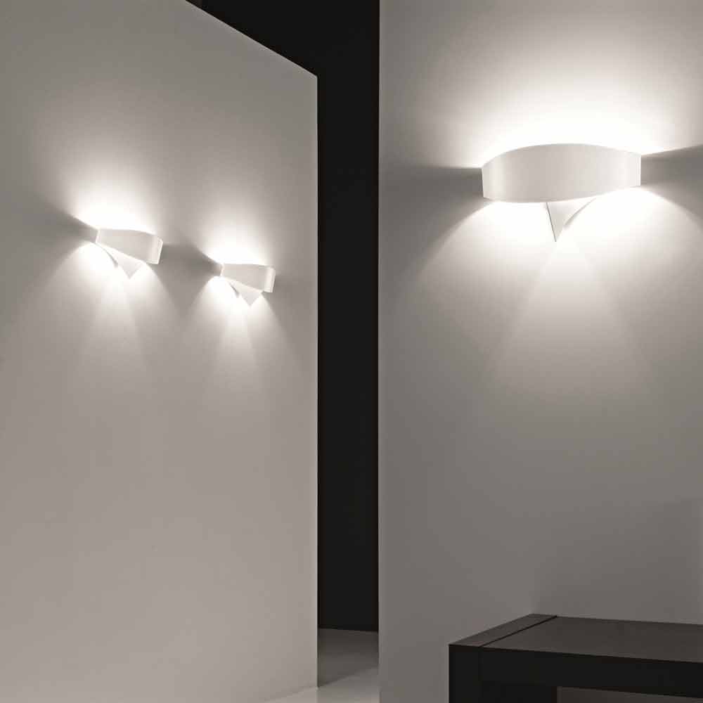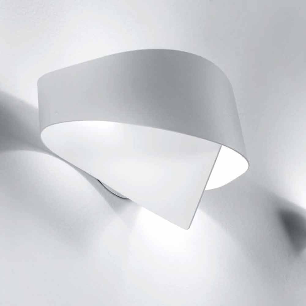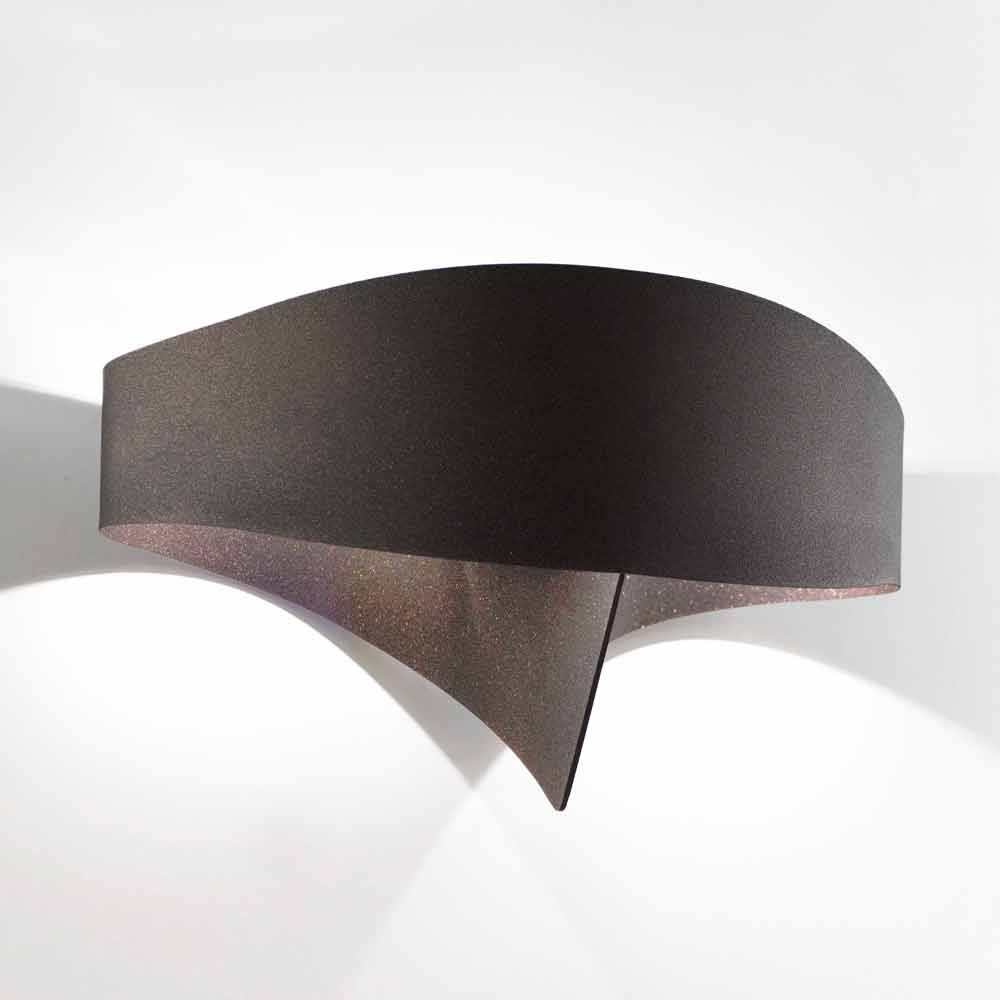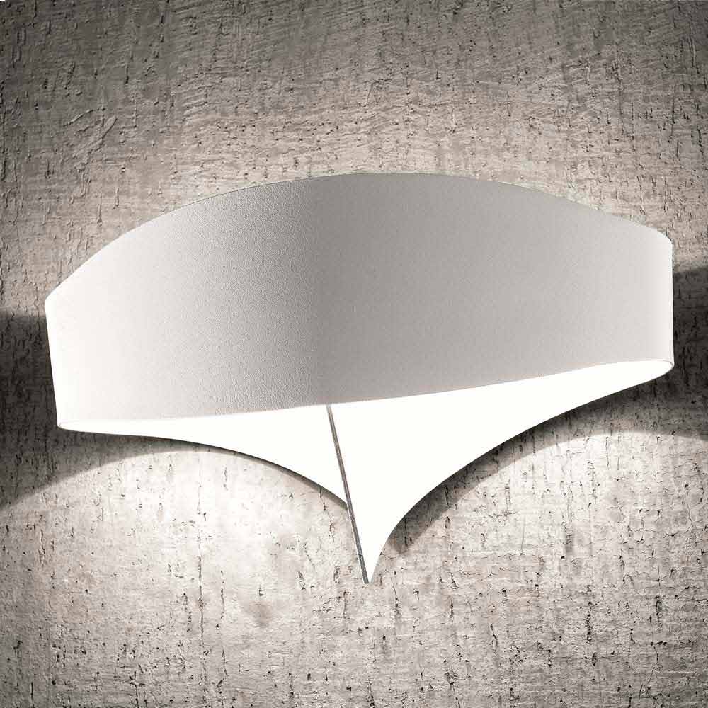 Selene Scudo Applikation aus lackiertem Stahl mit einem modernen Design Scudo ist eine Wandleuchte, die aus einem laserförmigen Stahlband entsteht, das von Hand zu einem ungeteilten und umhüllenden Element gefaltet wird. Erhältlich in verschiedenen Ausführungen und vorbereitet für den Einsatz mit 2 Glühbirnen G9 42 W oder 1x11W LED. Hergestellt in Italien .