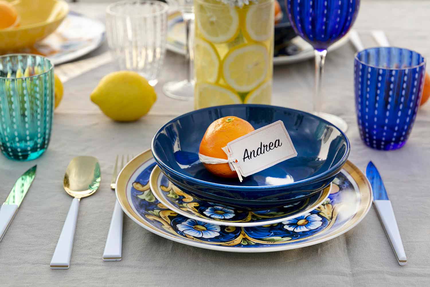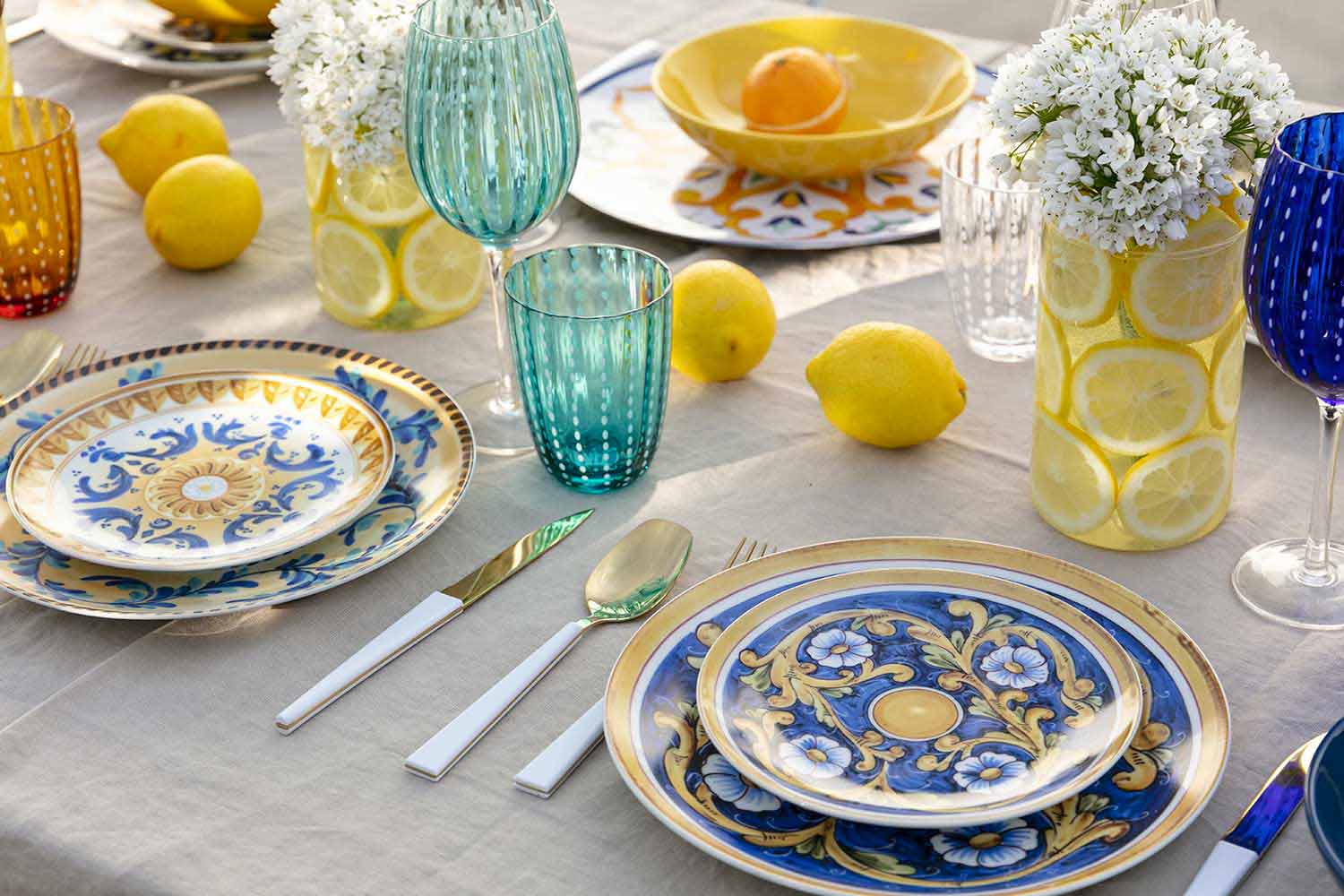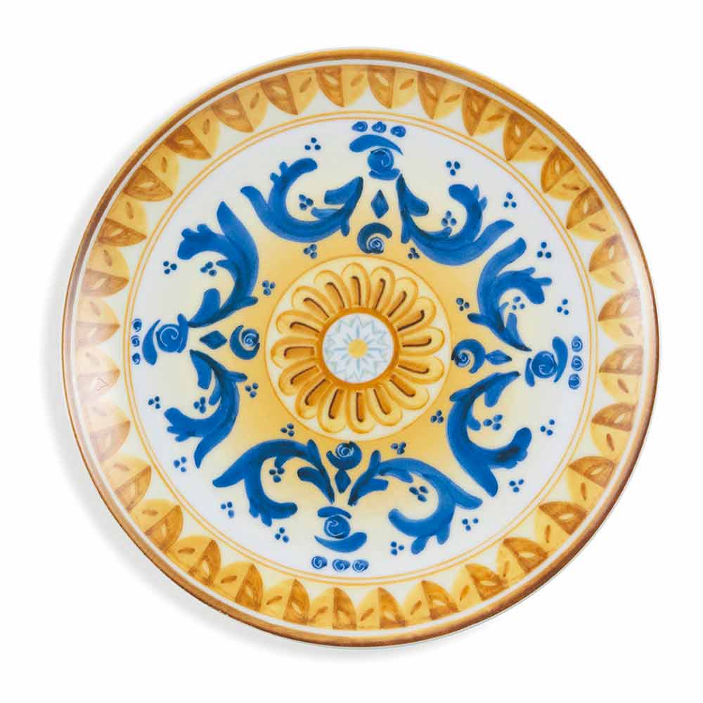 Inspiriert von seiner traditionellen Majolika bringt das Set Blau und Gelb auf den Tisch, die die Farben der Tiefsee und die Brillanz der Zitronen widerspiegeln, während die prächtigen Arabesken an die außergewöhnlichen dunkelbraunen Köpfe erinnern, Symbole der sizilianischen Kunst.