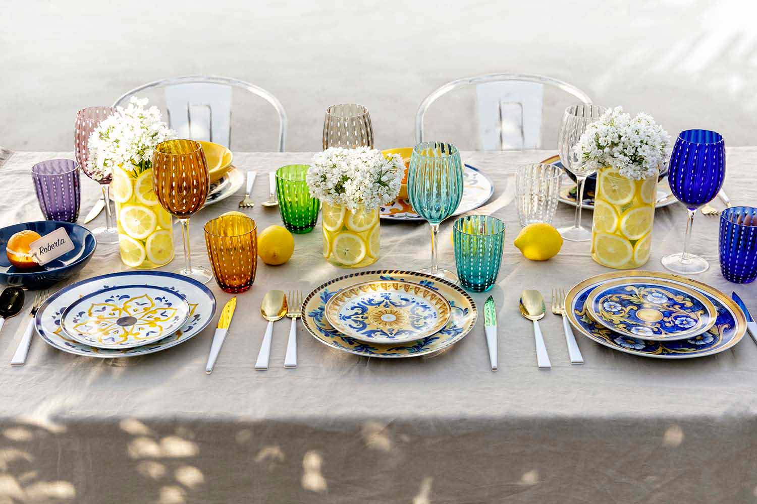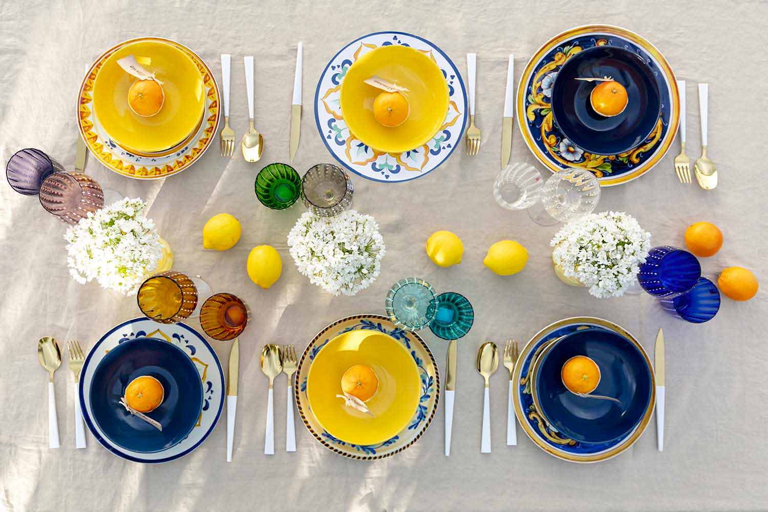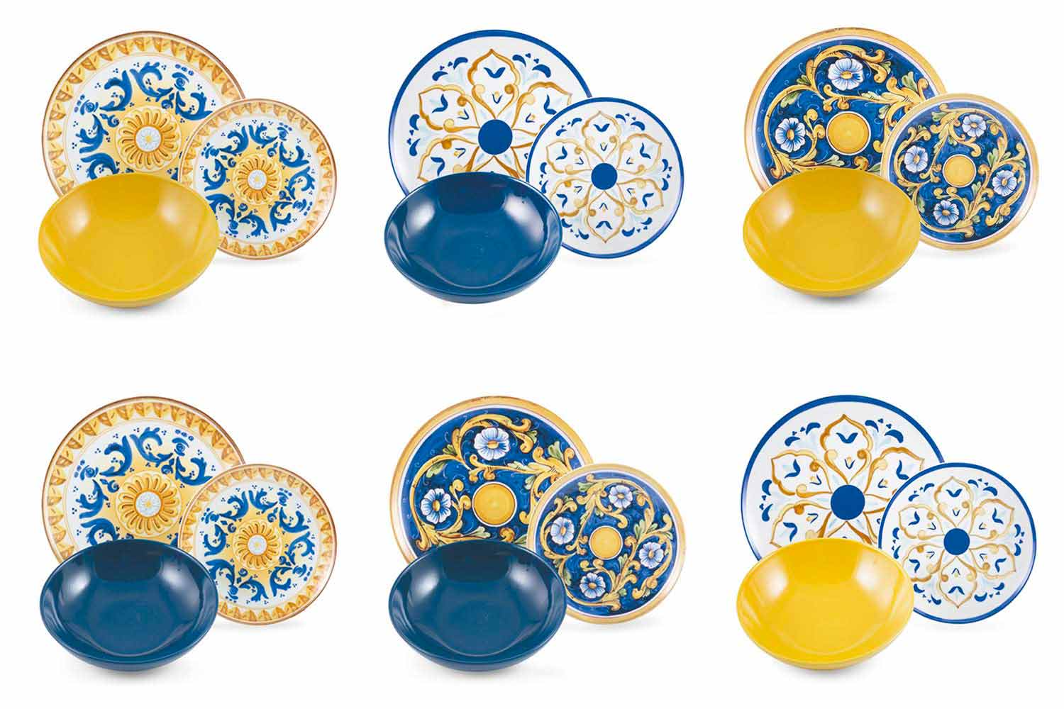 Inspiriert von seiner traditionellen Majolika bringt das Set Blau und Gelb auf den Tisch, die die Farben der Tiefsee und die Brillanz der Zitronen widerspiegeln, während die prächtigen Arabesken an die außergewöhnlichen dunkelbraunen Köpfe erinnern, Symbole der sizilianischen Kunst.