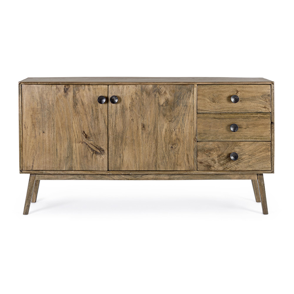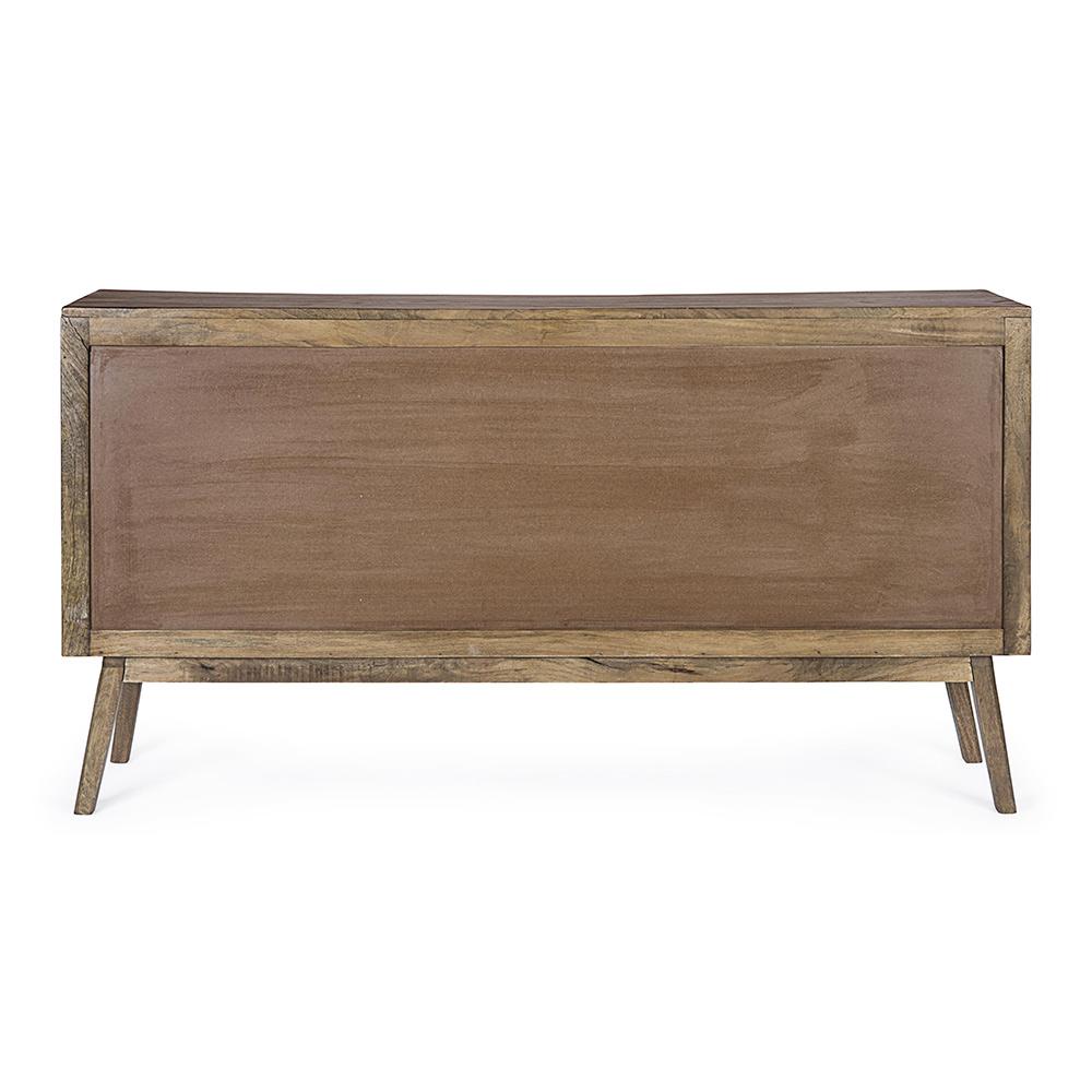 Dieses Design-Sideboard für das Wohnzimmer hat eine Struktur und Beine zum Zusammenbauen aus Mangoholz mit wasserbasierter Oberfläche und einer Rückseite aus MDF. Das Fach enthält ein Regal und die Knöpfe sind aus Stahl. Das Ergebnis ist ein Vintage-Accessoire mit ethnischemFlair.