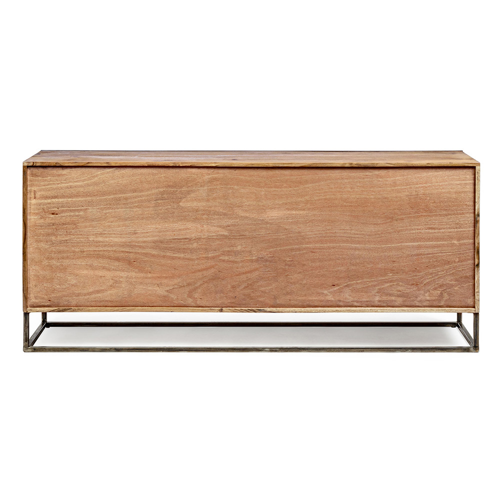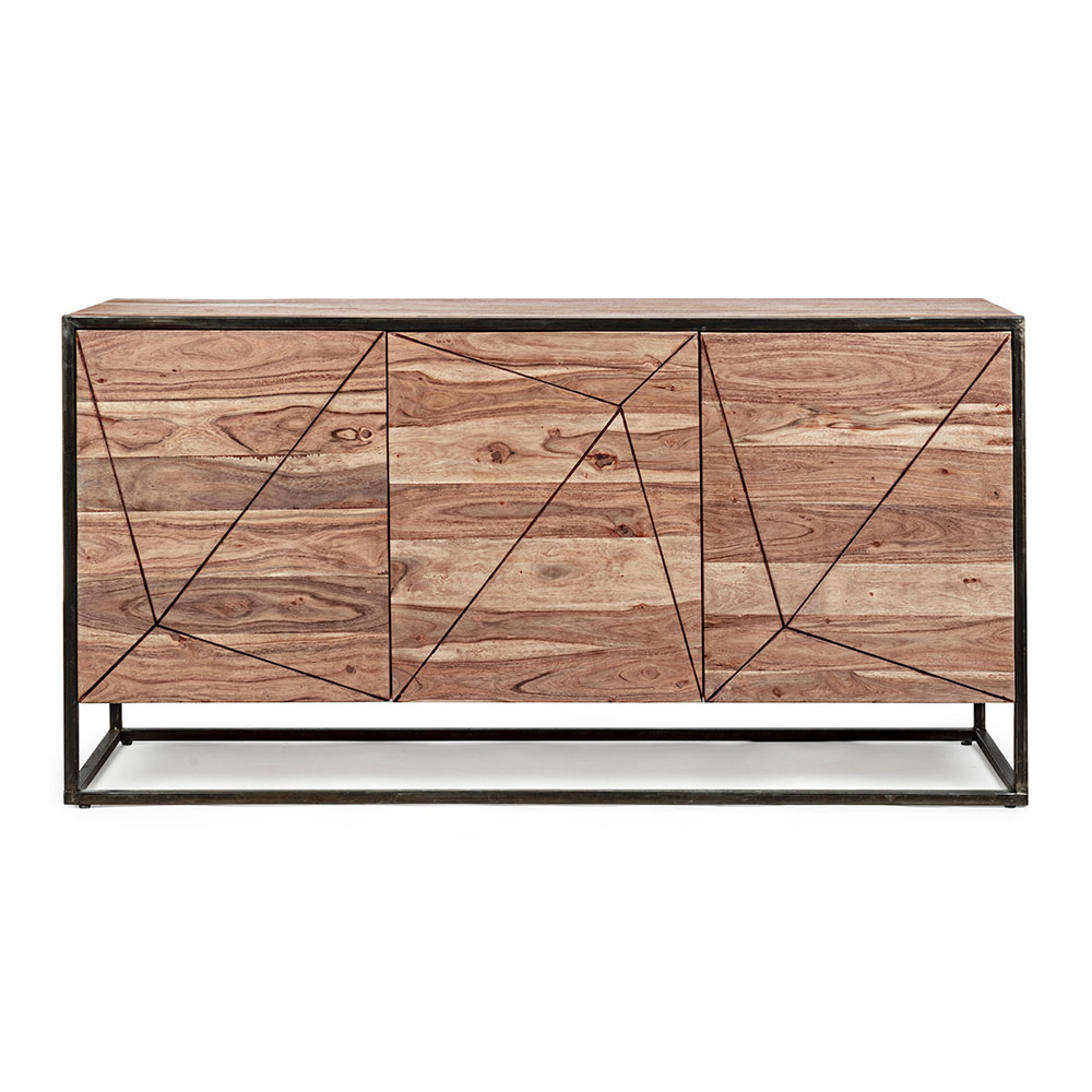 Dieses Design-Sideboard für das Wohnzimmer hat eine Struktur aus Akazienholz und epoxidpulverbeschichtetem Stahl mit Sperrholzrückseite.
