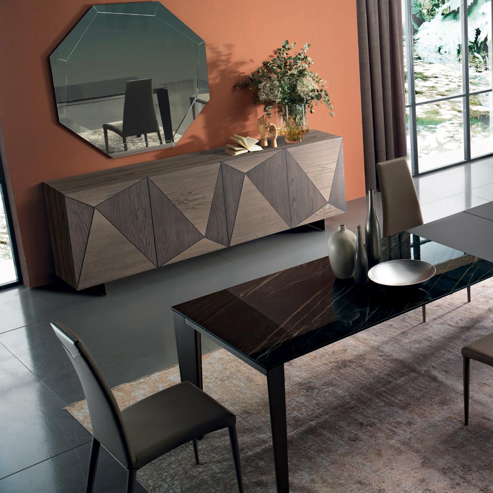 Wohnzimmer-Sideboard aus Eschenfurnier in geknoteter Eiche, ausgestattet mit 3 oder 4 handgefertigten lackierten Türen mit Push&Pull-Öffnungssystem, in dem sich transparenteEinlegeböden aus gehärtetem Glas (6 mm dick, maximale Belastung 20 kg) und Leinenfüße befinden. Ein Einrichtungsaccessoire mit einem imposanten und raffinierten Stil , ideal für diejenigen, die ihre Umgebung auf ebenso funktionale wie raffinierte und innovative Weise bereichern möchten. Seine exklusive Ästhetik wird durch die besondere Verarbeitung der fachmännisch handbemalten Türen einzigartig, die die Qualität und den Wert des Produkts weiter steigern. Die 100 % Made in Italy-Produktion und die Verwendung hochwertiger Rohstoffe verleihen dem Sideboard außerdem Stabilität , Widerstandsfähigkeit und eine hervorragende Haltbarkeit im Laufe der Zeit für ein optimales Ergebnis.