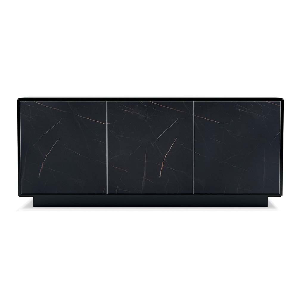 Wohnzimmer-Sideboard mit Sockelstruktur und Sockel aus matt lackiertem Holz , 2 oder 3 Türen mit Aluminiumprofil und Fronten aus HPL-Laminat mit Marmoreffekt, ausgestattet mit Push&Pull-Öffnungssystem und Innenregalen aus transparentem Hartglas (Stärke 6 mm, maximale Belastung 20 kg). Eine Ergänzung, die aus einem 100 % Made in Italy-Verfahren stammt und durch die Verwendung hochwertiger Rohstoffe entsteht, um einem Produkt mit moderner Persönlichkeit und starker szenografischer Wirkung Leben einzuhauchen, ideal für diejenigen, die einen raffinierten und innovativen Einrichtungsstil lieben . Um seinen Wert noch mehr zu unterstreichen, ist die HPL-Oberseite ein Hochdrucklaminat , das äußerst beständig gegen Chemikalien, Abrieb und Kratzer ist und es uns ermöglicht, eine solide Trägeroberfläche mit ausgezeichneter Haltbarkeit im Laufe der Zeit anzubieten.