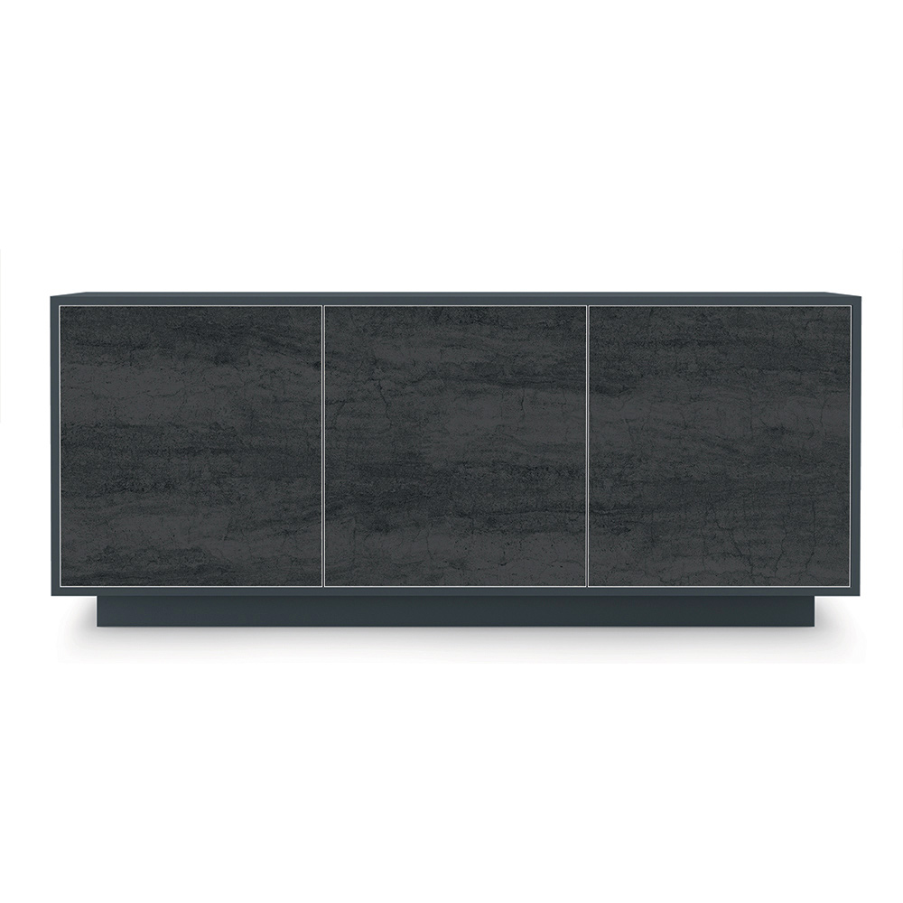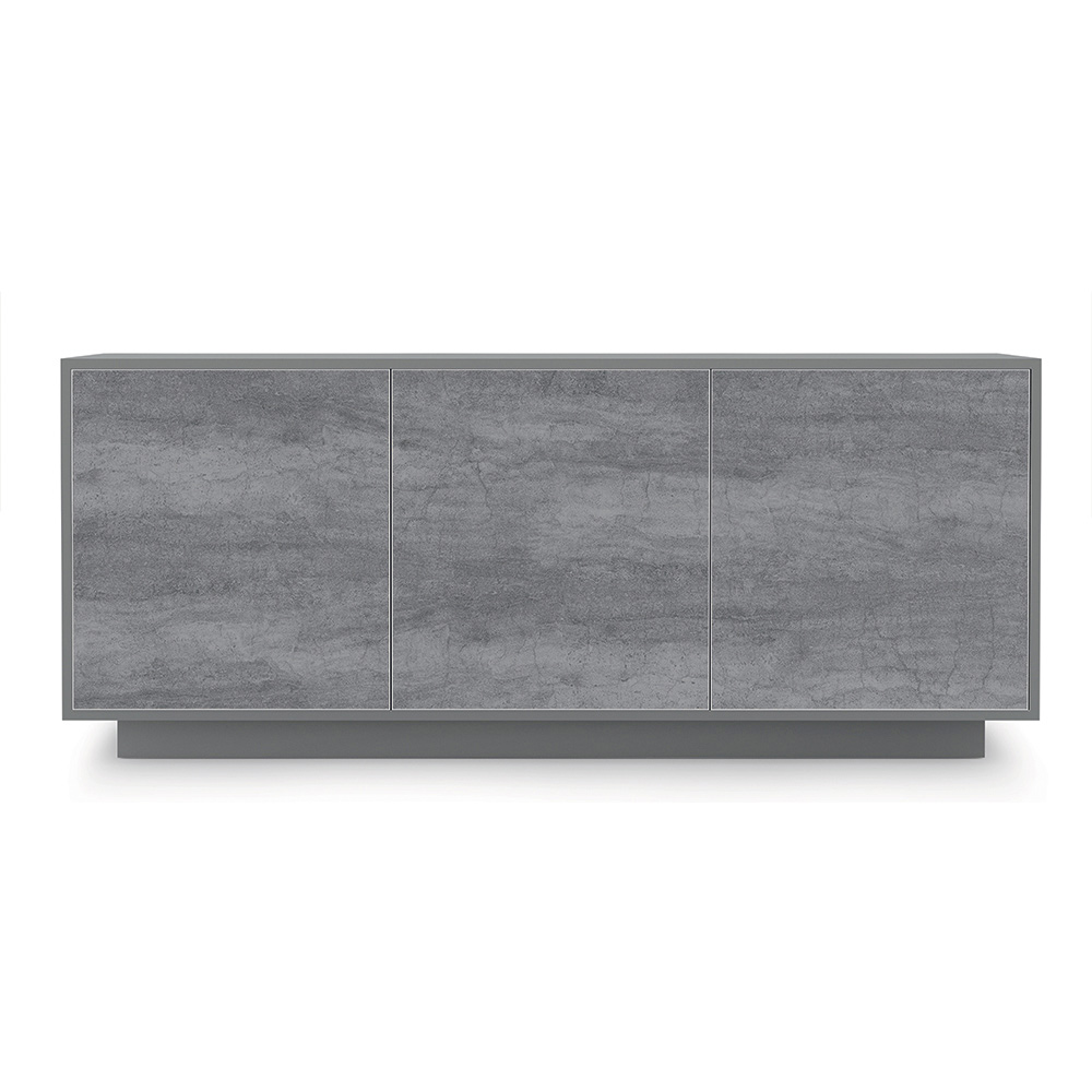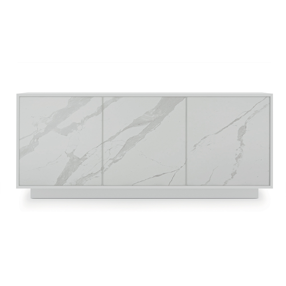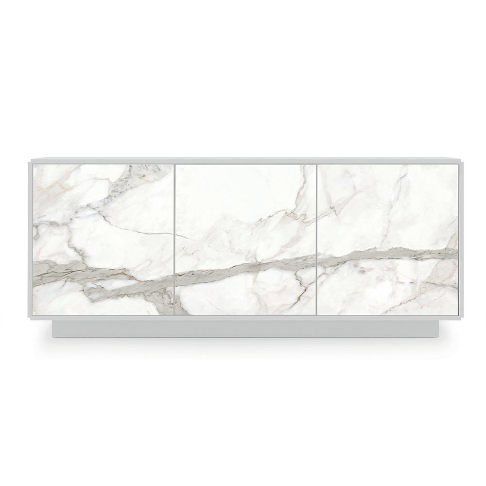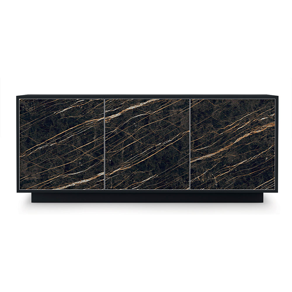 Komplett in Italien hergestelltesWohnzimmer-Sideboard mit Struktur und Sockel aus matt lackiertem Holz , 2 oder 3 Türen mit Aluminiumprofil und Fronten aus Laminam-Keramik, ausgestattet mit Push&Pull-Öffnungssystem und Innenregalen aus transparentem Hartglas (Stärke 6 mm, maximale Tragfähigkeit 20 kg). ). Ein imposantes und luxuriöses Design , das jedem Raum des Hauses einen Hauch von exklusivem Stil verleiht. Seine Ästhetik entsteht aus dem Wunsch , Funktionalität und Eleganz zu einem Ergebnis mit moderner Persönlichkeit und starker szenografischer Wirkung zu verbinden, ideal für diejenigen, die einen raffinierten und innovativen Einrichtungsstil lieben.
