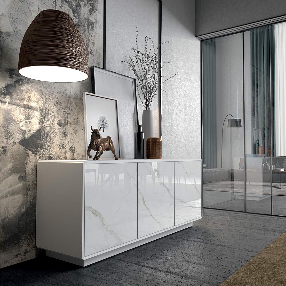 Wohnzimmer-Sideboard aus lackiertem Holz mit Keramiktüren, hochwertige Qualität Made in Italy.