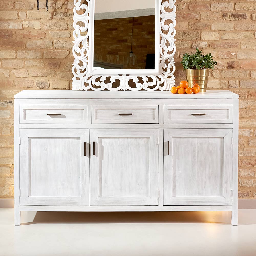 Ausgestattet mit 3 Türen und 3 Schubladen bietet es ein ausgezeichnetes Stauvolumen, sodass Sie Geschirr, Wäsche oder Alltagsgegenstände ordentlich und stilvoll verstauen können.