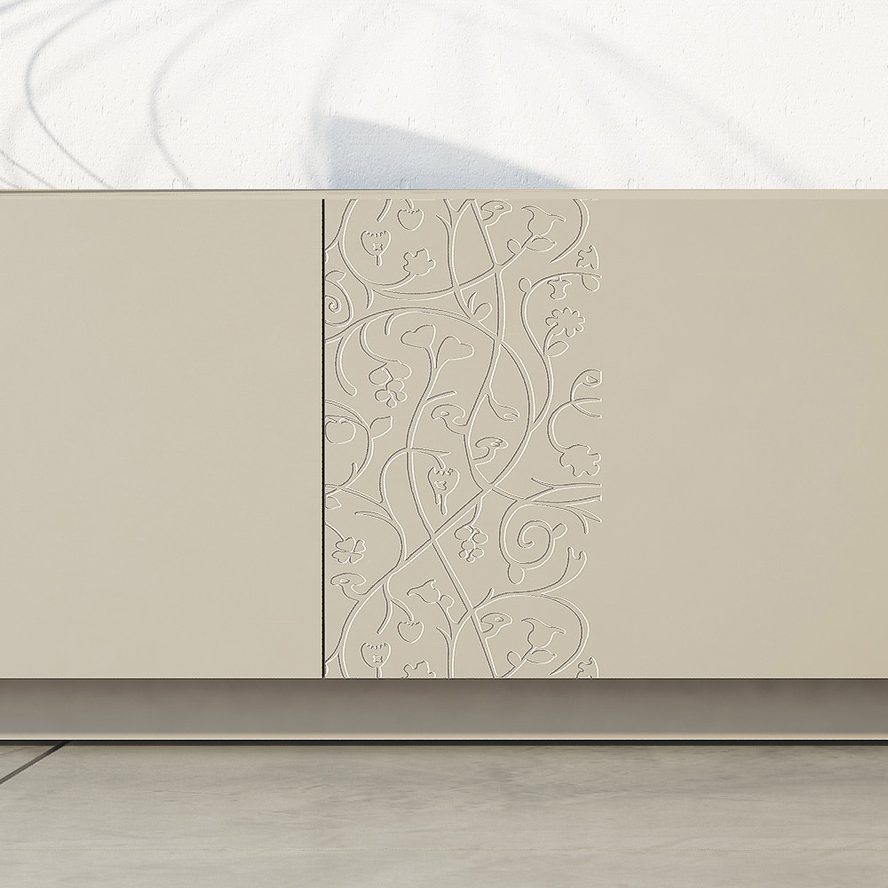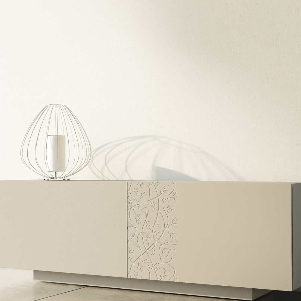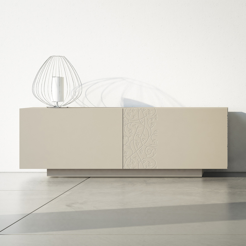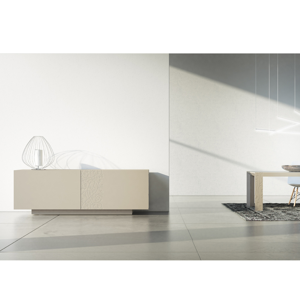 Wohnzimmer-Sideboard mit matt lackierter MDF- Struktur in Alpakagrau, bestehend aus 2 koplanaren Schiebetürendie hohe Funktionalität und Praktikabilität garantieren und vom lackierten Sockel , der viel Stabilität bietet. Dieses Produkt ist voller Geschmack und Design dank seiner eleganten und raffinierten Oberflächen und der partiellen Basrelief-Dekoration der Türen, die es in seiner Art einzigartig machen.Die verschiedenen Materialien, die für die Konstruktion verwendet werden, bieten eine hohe Qualität und Beständigkeit im Laufe der Zeit und verleihen dem Produkt eine einzigartige und unvergessliche Note.