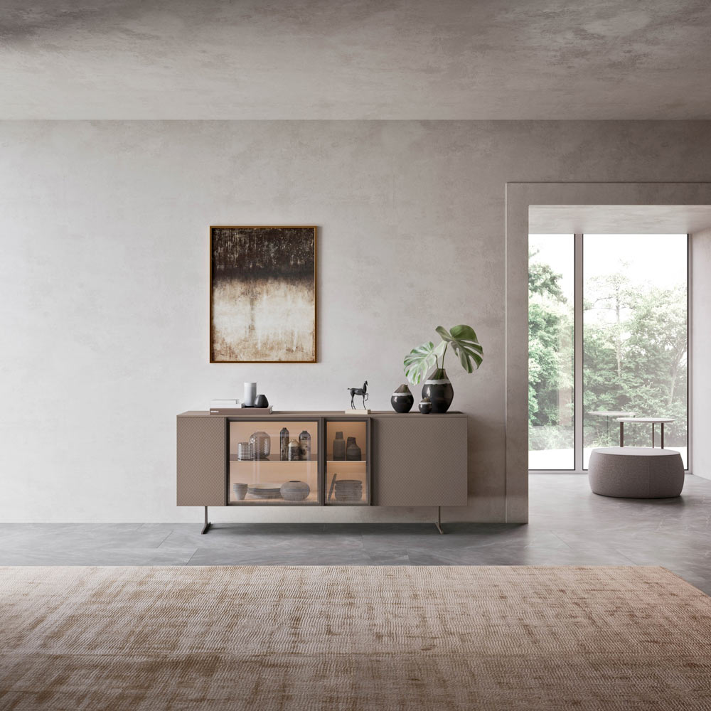 Dieses Sideboard für das Wohnzimmer hat eine Struktur aus matt terrafarbenem Lack, mit Außentüren aus Holz in der originalen Rombo matt lackierten Terra-Oberfläche mit 22 mm dickem Steppmotiv und zentralen Türen aus transparentem Glas und brüniertem Rahmen. Der widerstandsfähige Sockel ist aus brüniertem Metall und die Oberseite hat eine Dicke von 12 mm. In den Türfächern, die mit einem Push & Pull-System geöffnet werden können, befinden sich Ablagen aus bronziertem Glas.