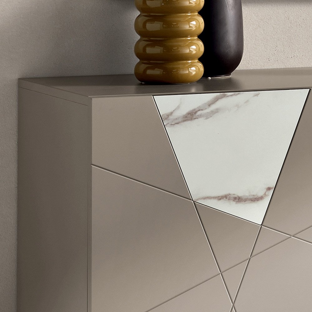 Die Konstruktion besteht aus einem melaminbeschichteten Holzrahmen und pantografierten MDF-Türen mit dekorativen Gravuren, die sich in einem eleganten geometrischen Muster kreuzen. Die Glaseinsätze in Marmoroptik bereichern die Oberfläche und erzeugen ein raffiniertes Zusammenspiel von Grafik und Material.