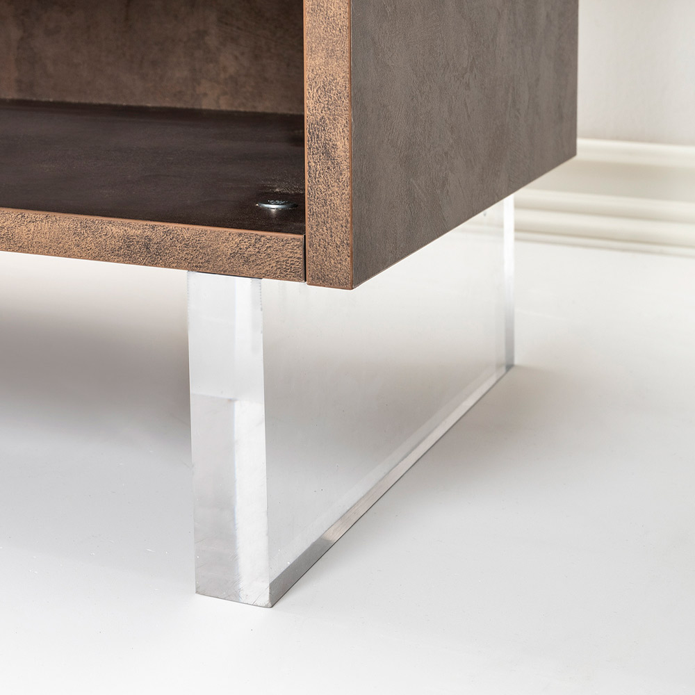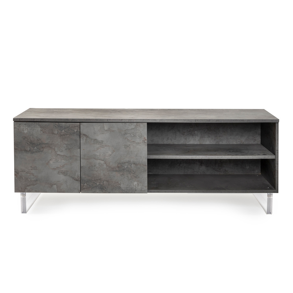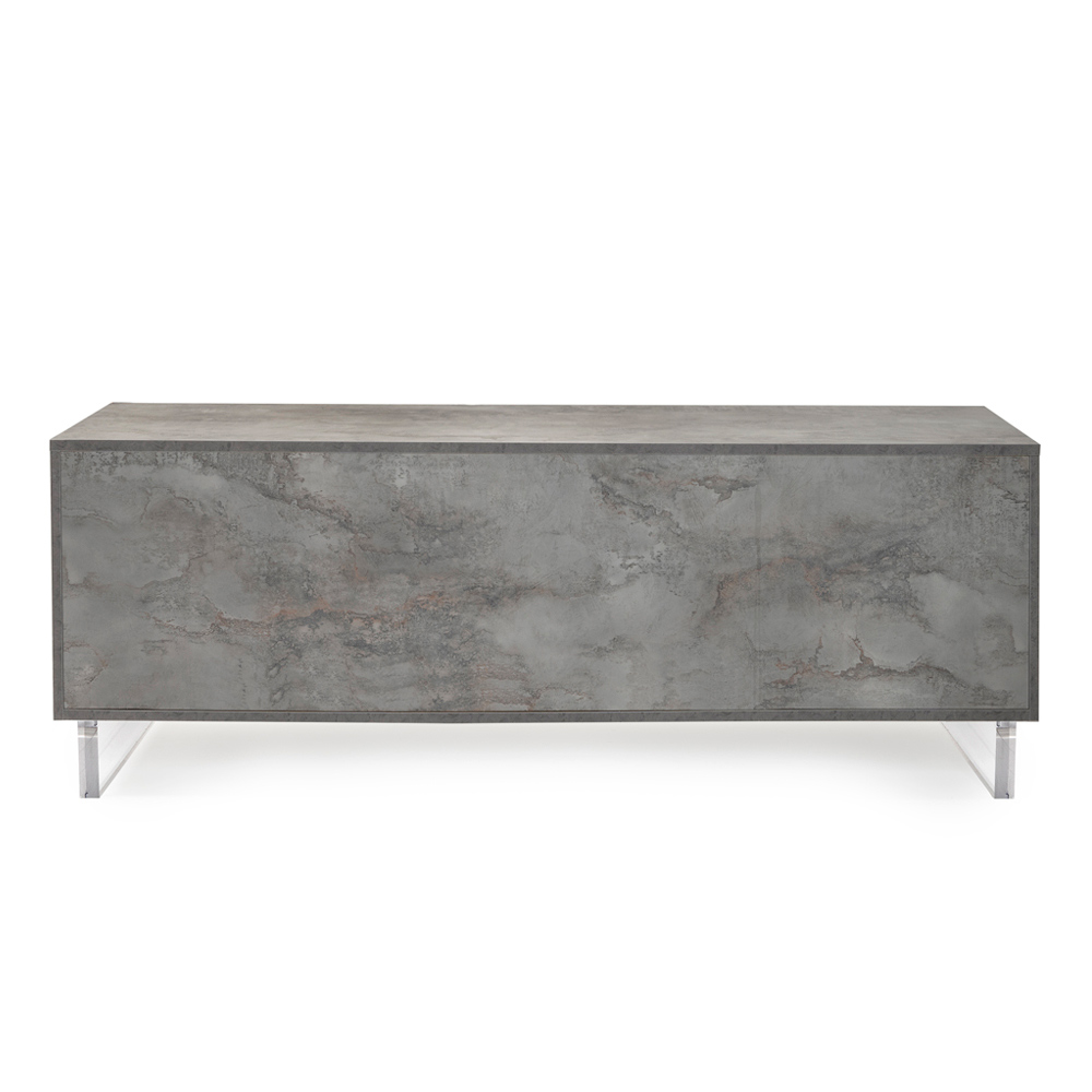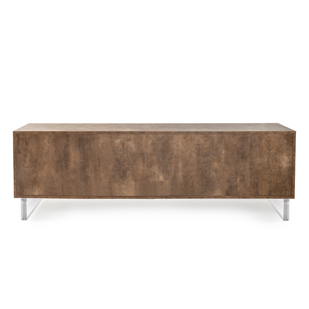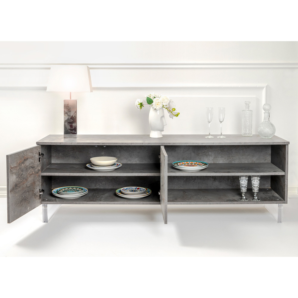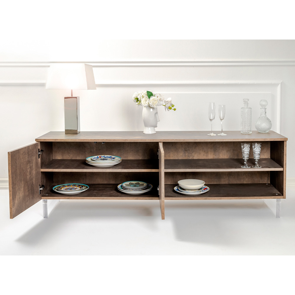 Mit seinen Plexiglasfüßen scheint das Sideboard den Boden zu berühren, ein Designdetail, das einen Hauch von Modernität und Leichtigkeit verleiht. Im Inneren warten ordentliche Regale darauf, alles aufzubewahren, was Sie lieben, von Büchern bis hin zu Alltagsgegenständen, und bieten eine elegante Lösung für Ihr Organisationsbedürfnis.
