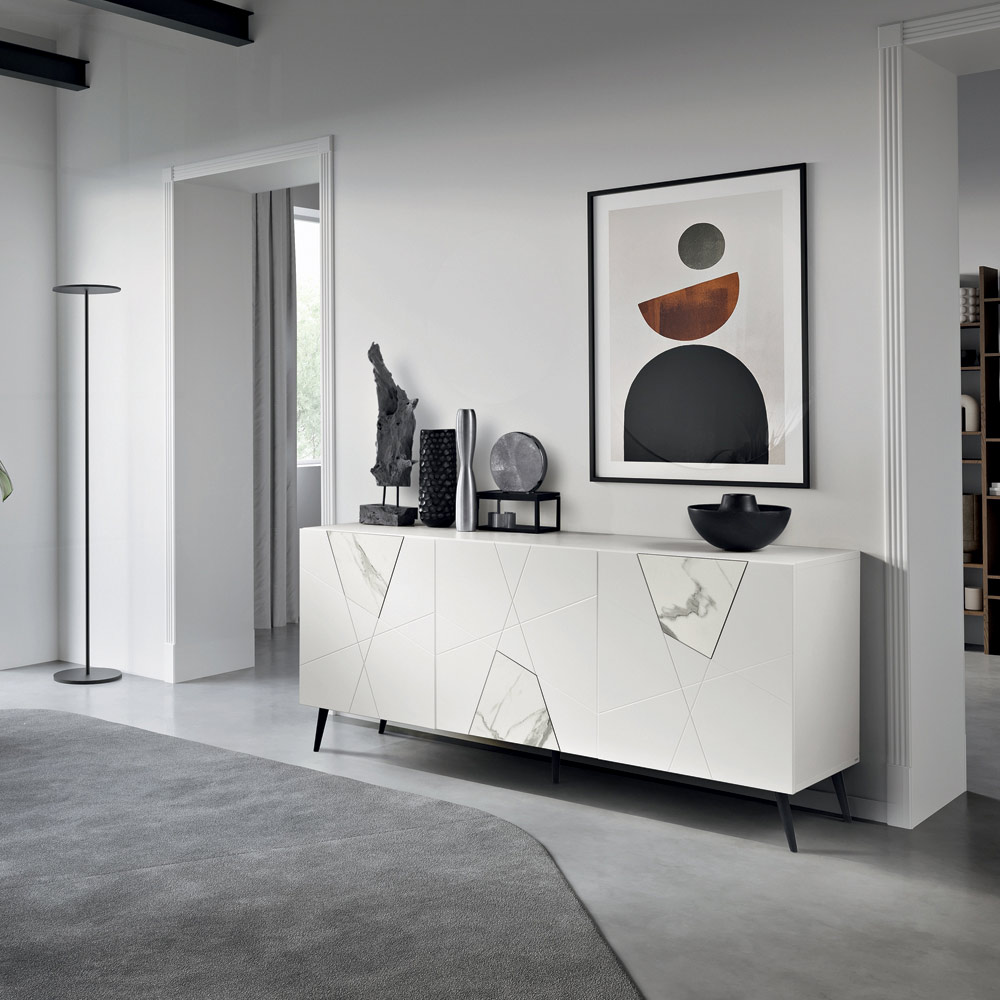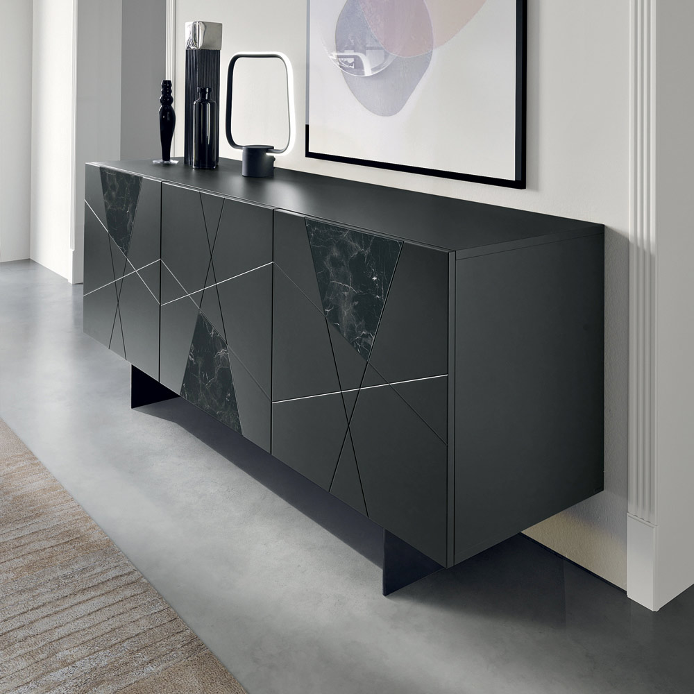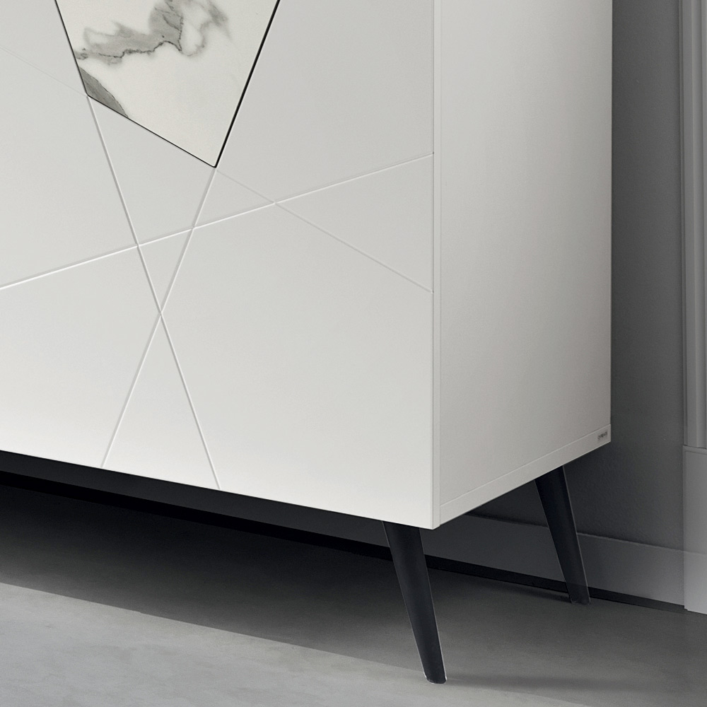 Die Konstruktion besteht aus einem melaminbeschichteten Holzrahmen und pantografierten MDF-Türen mit dekorativen Gravuren, die sich in einem eleganten geometrischen Muster kreuzen. Die Glaseinsätze in Marmoroptik bereichern die Oberfläche und erzeugen ein raffiniertes Zusammenspiel von Grafik und Material.