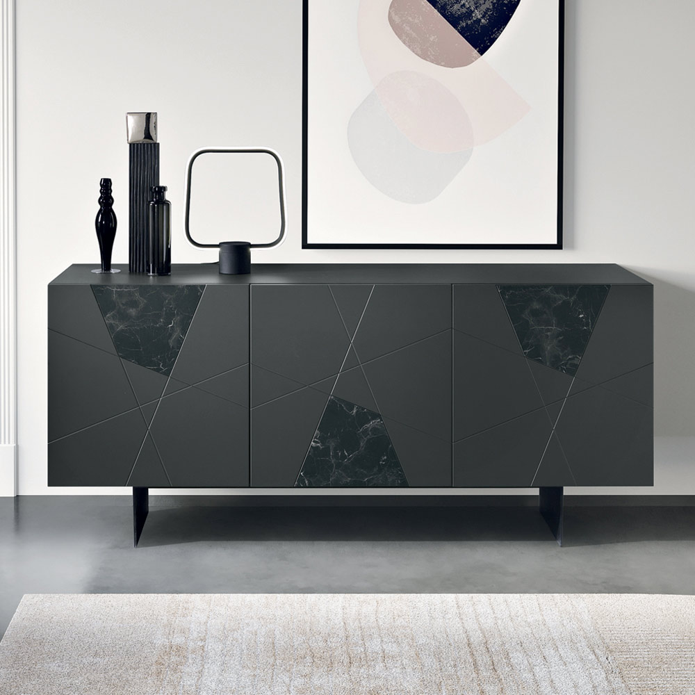 Die verfügbaren Oberflächen verleihen dem Sideboard Ausgewogenheit und Eleganz und machen es so zur perfekten Ergänzung für moderne und anspruchsvolle Räume. Der Sockel hebt die Konstruktion leicht an und sorgt für Stabilität und eine zeitgemäße Ästhetik.
