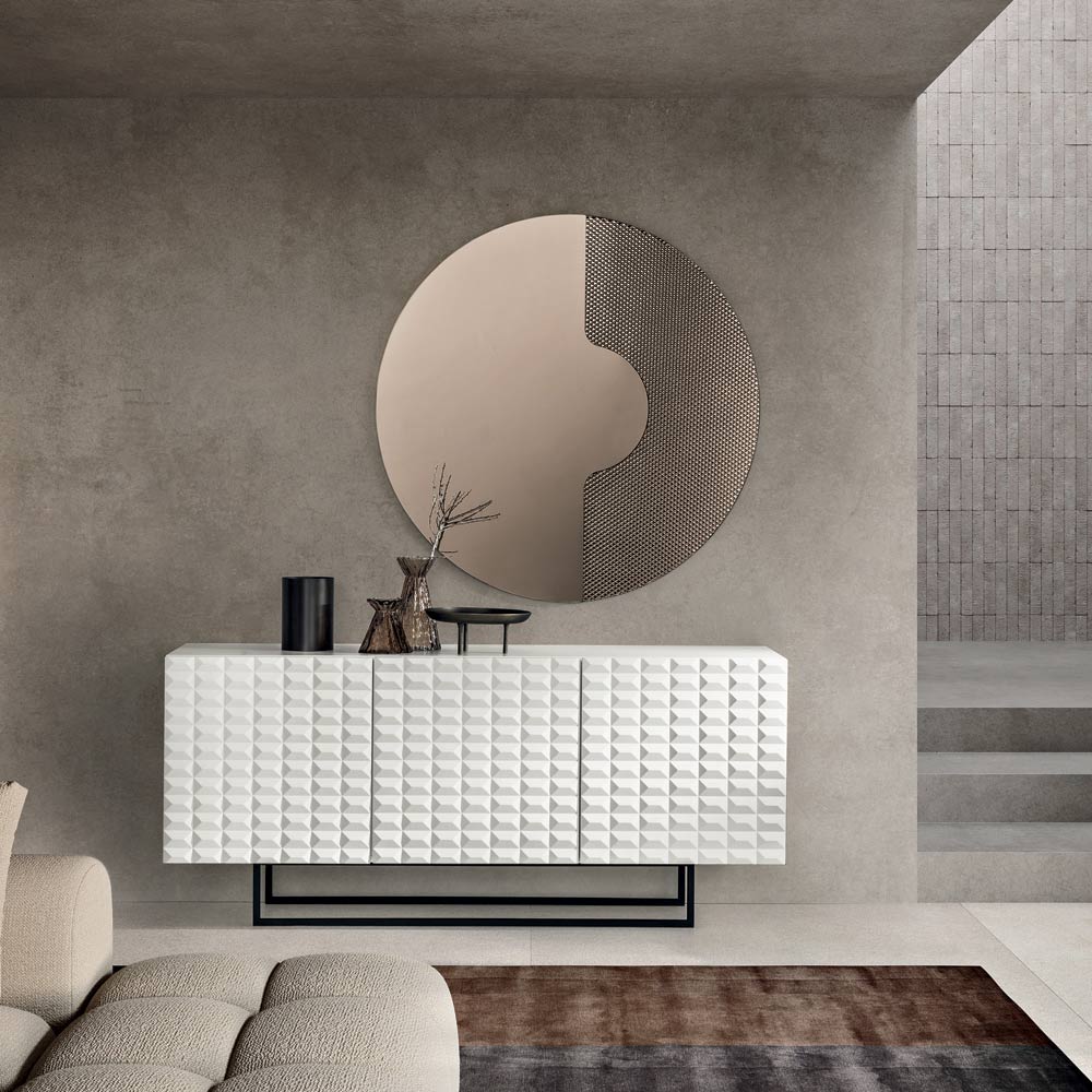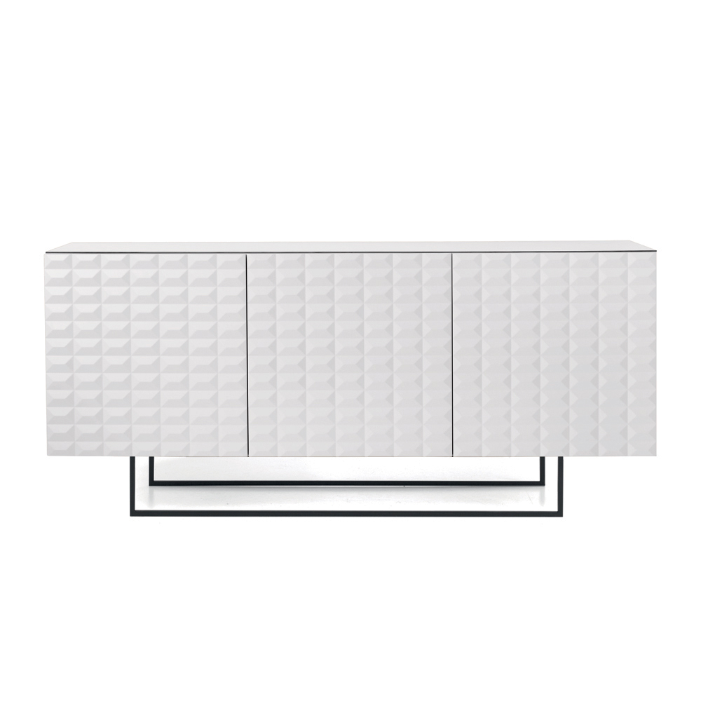 Die PVC-beschichteten MDF-Türen weisen eine dreidimensionale, geometrische Textur auf, die an die berühmten Rautenmuster erinnert und ein faszinierendes Licht- und Schattenspiel erzeugt. Dieses Detail verleiht dem Sideboard optische Tiefe und macht es zu einem echten Blickfang im Raum.