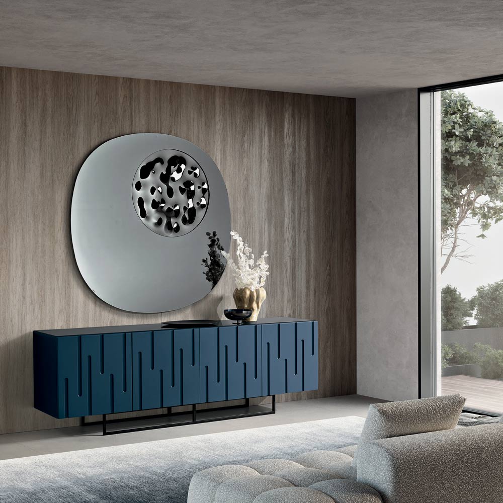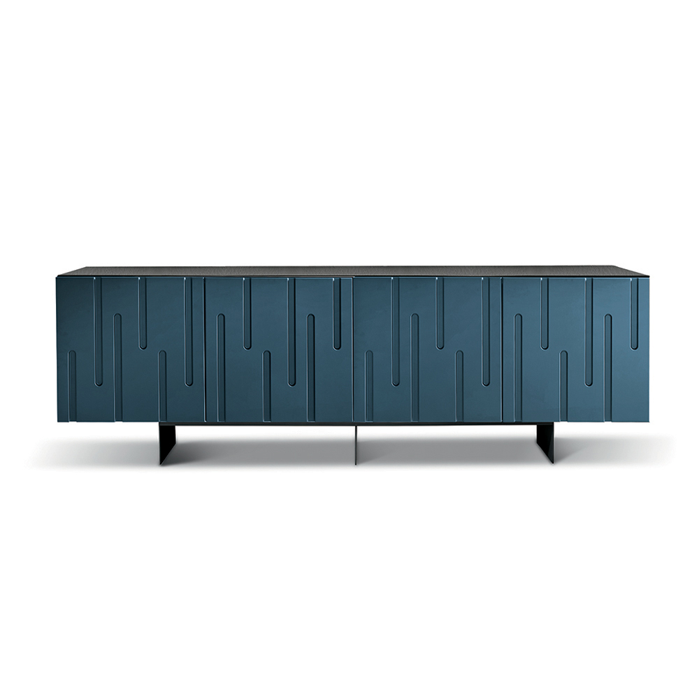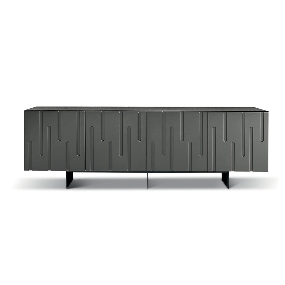 Die PVC-beschichteten MDF-Türen weisen unregelmäßige, vertikale Einschnitte auf, die an die natürliche Form von Stalaktiten und Stalagmiten erinnern und so einen raffinierten, strukturierten und dynamischen Effekt erzeugen. Dieses Zusammenspiel der Reliefs verleiht der Oberfläche Tiefe und Bewegung, verstärkt den Lichteinfall und macht das Sideboard zum Mittelpunkt des Raumes.