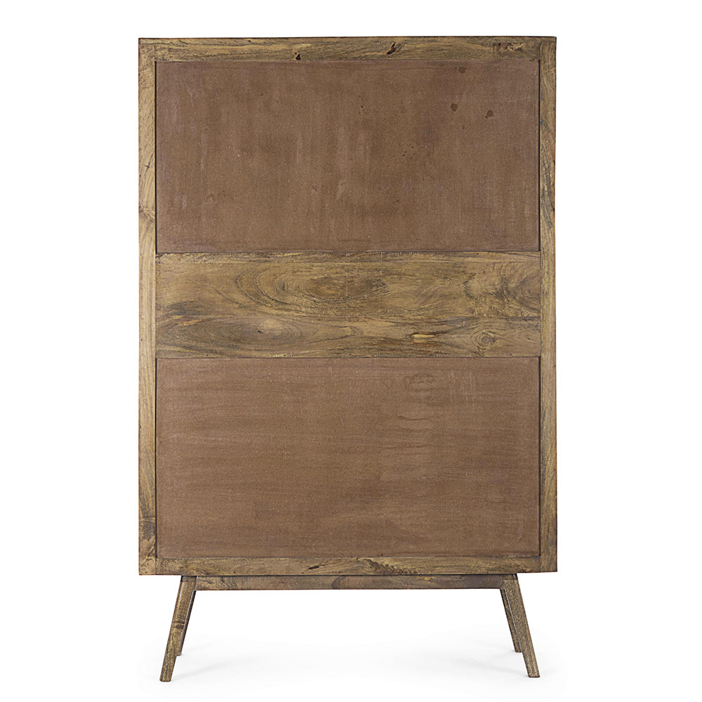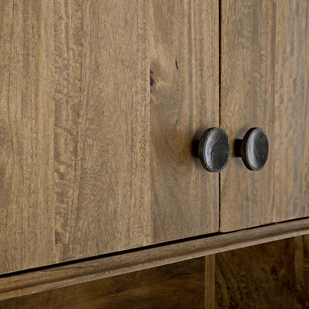 Dieses Design-Sideboard für das Wohnzimmer hat eine Struktur und Beine zum Zusammenbauen aus Mangoholz mit wasserbasierter Oberfläche und einer Rückseite aus MDF. Das Fach enthält ein Regal und die Knöpfe sind aus Stahl. Das Ergebnis ist ein Vintage-Accessoire mit ethnischemFlair.
