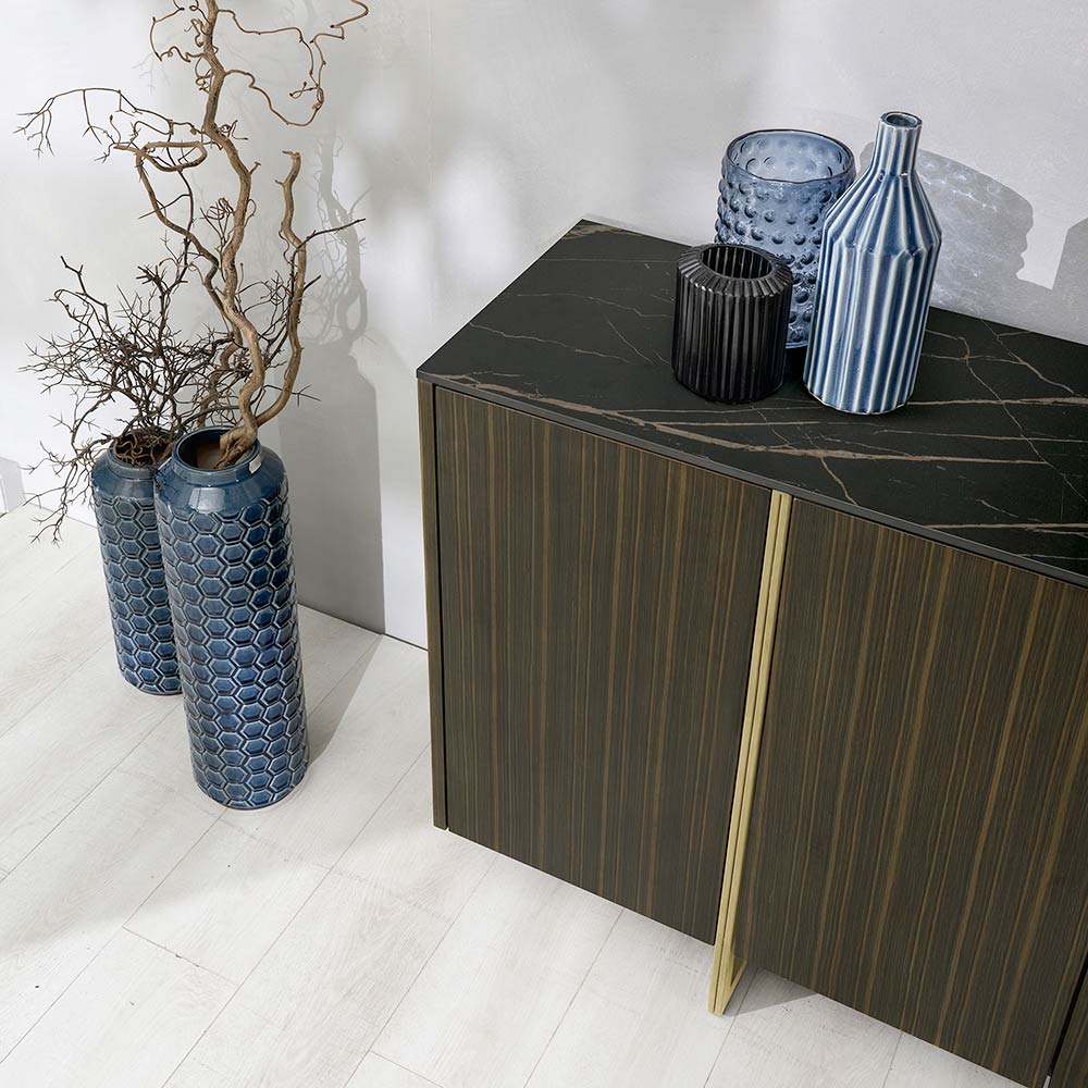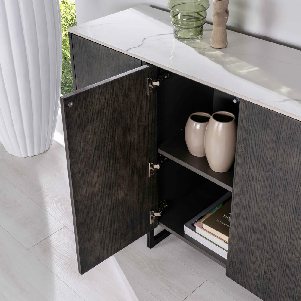 Sideboard für den Innenbereich mit Keramikplatte in Marmoroptik , furnierter MDF- Struktur, Metallbeinen und 4 Türen mit Push&Pull-System und sanftem Schließen .
