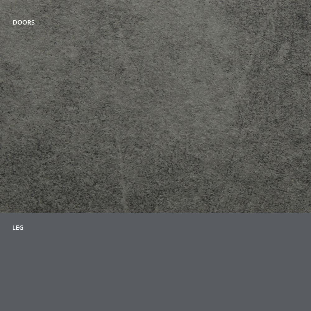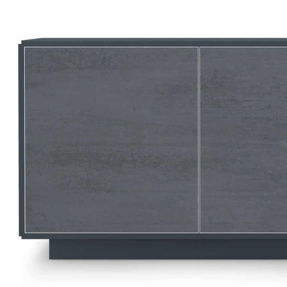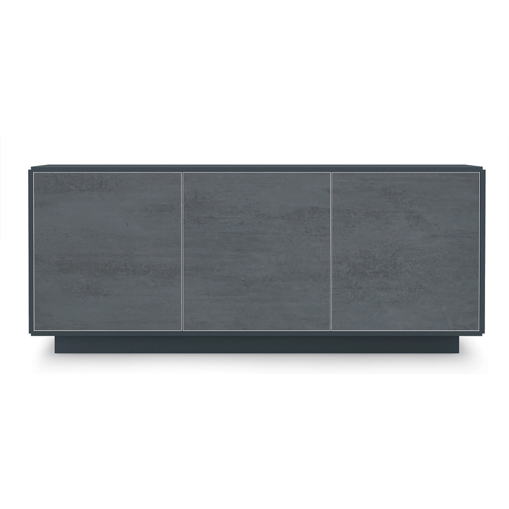 Modernes Sideboard mit Sockelstruktur und Sockel aus lackiertem Holz mit mattem Schiefergrau-Finish, 2 oder 3 Türen mit Aluminiumprofil und Fronten aus HPL-Laminat in Steinoptik, ausgestattet mit Push&Pull-Öffnungssystem und Innenregalen aus transparentem Hartglas (Stärke 6 mm, maximale Tragfähigkeit 20 kg). Dieses zu 100 % in Italien hergestellte Einrichtungsaccessoire aus hochwertigen Materialien stellt die perfekte Kombination aus Funktionalität und Design dar und sorgt für ein Ergebnis mit moderner Persönlichkeit und starker szenografischer Wirkung , ideal für diejenigen, die einen raffinierten und eleganten Einrichtungsstil lieben. Avantgarde . Um seinen Wert noch mehr zu unterstreichen, ist die HPL-Oberseite ein Hochdrucklaminat , das äußerst beständig gegen Chemikalien, Abrieb und Kratzer ist und es uns ermöglicht, eine solide Trägeroberfläche mit ausgezeichneter Haltbarkeit im Laufe der Zeit anzubieten.